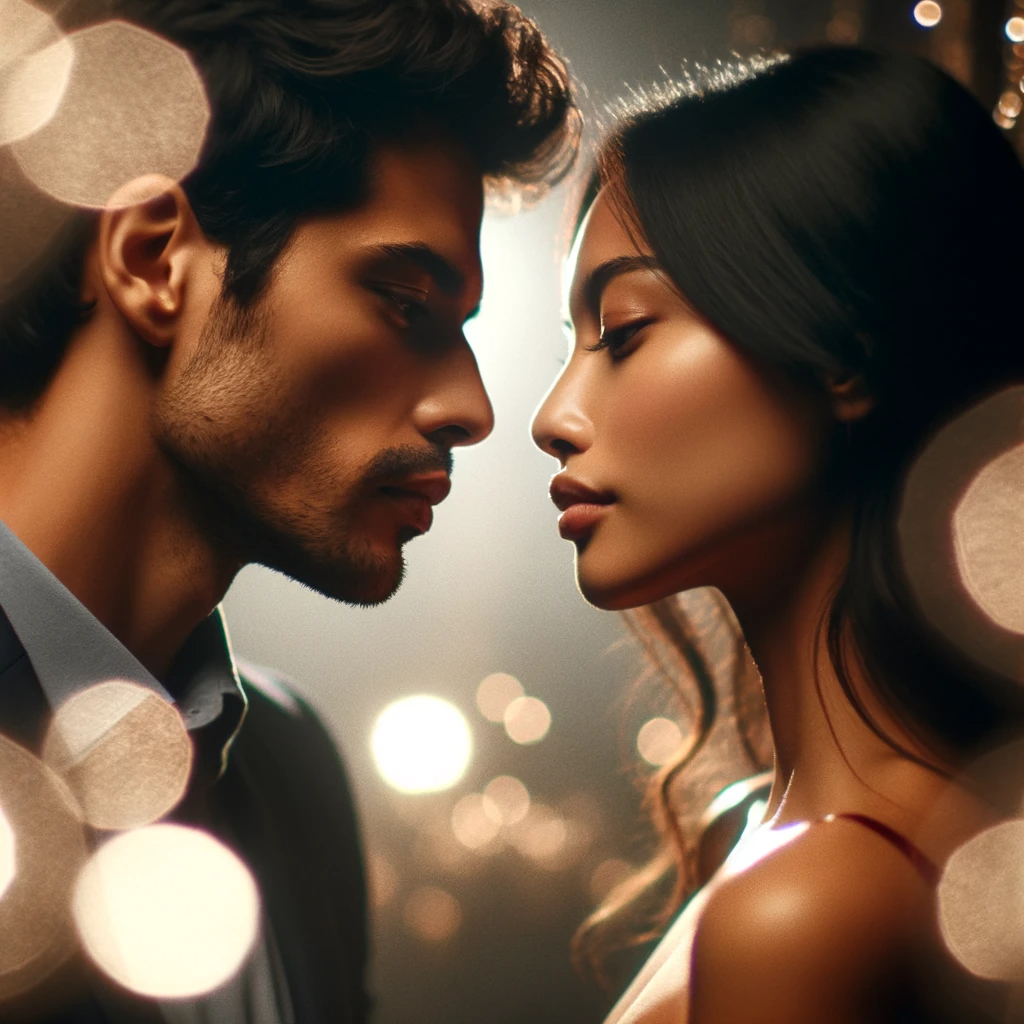 Couple vu de profil, avec un angle légèrement en faveur de l'homme, se faisant face en se regardant les lèvres. L'arrière-plan est flou et scintillant. Le cadrage inclut leurs têtes et épaules. L'homme est d'origine hispanique et la femme d'origine sud-asiatique. L'éclairage est doux et romantique, renforçant l'atmosphère intime de la scène.