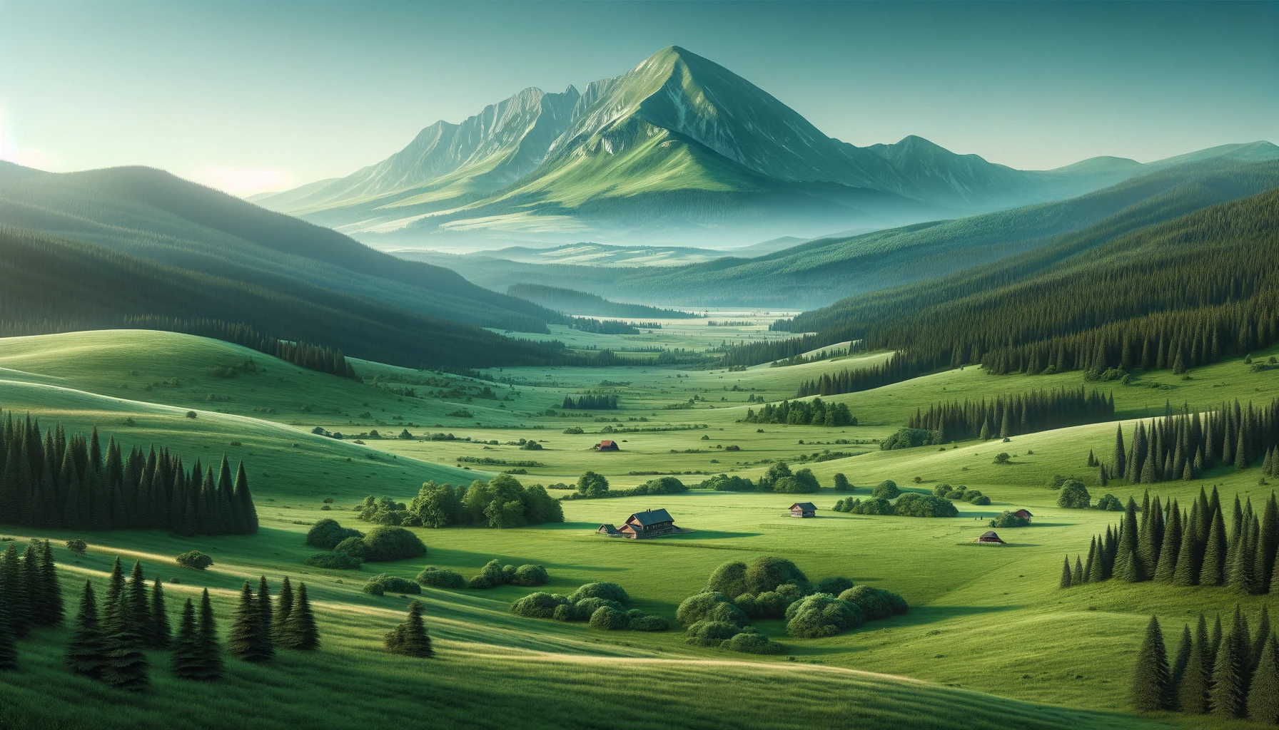 Une image de qualité photo réaliste d'une vaste plaine herbeuse verte ondulante. En arrière-plan, il y a une montagne lointaine derrière une forêt dense. Éparpillées autour de la montagne, il y a quelques maisons de montagne.