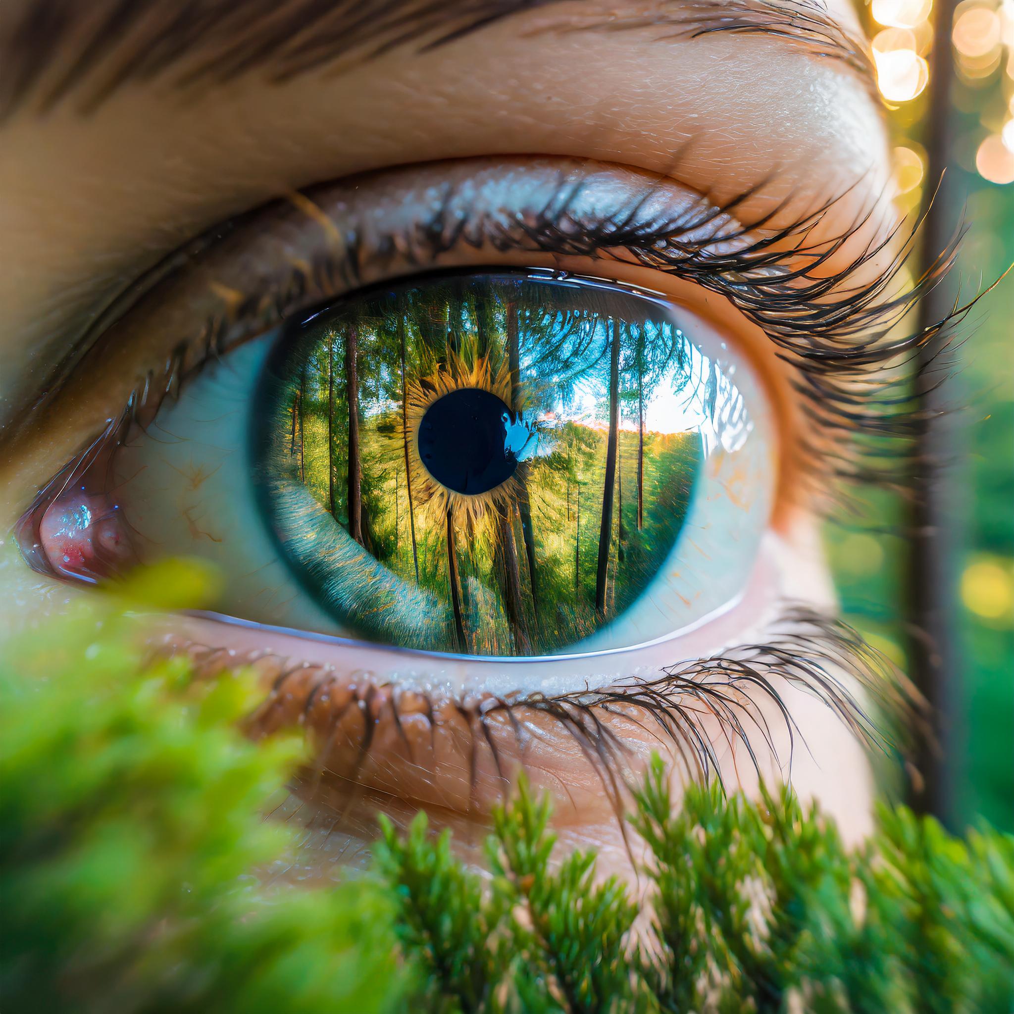 Un gros plan sur un œil reflétant une vaste forêt. L’œil doit être détaillé, montrant des couleurs vives et des textures, avec une mise au point nette sur la pupille. La scène de forêt reflétée dans l’œil devrait être luxuriante et dense, présentant une variété d’arbres avec un feuillage vert riche. L'éclairage dans la forêt devrait suggérer une journée ensoleillée et lumineuse, projetant des ombres douces à travers les arbres. L'image globale devrait évoquer un sentiment de mystère et de connexion avec la nature.