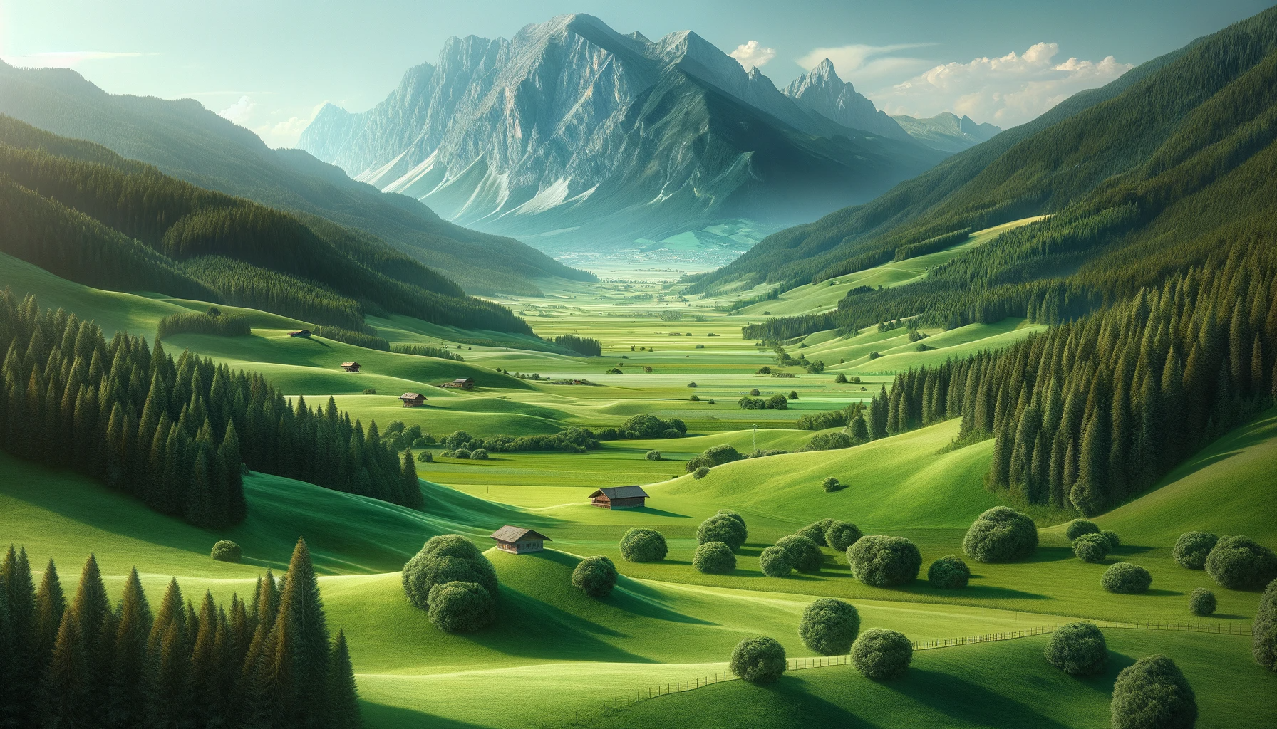 Une image hyper-réaliste présentant une vaste plaine ondulante recouverte d'une herbe verte vibrante, s'étendant aussi loin que le regard peut porter. À l'arrière-plan lointain, une montagne majestueuse se profile, partiellement dissimulée par une forêt épaisse et luxuriante. Éparpillées autour de la base de la montagne se trouvent des maisons de montagne pittoresques et rustiques, se fondant sans heurt dans le paysage naturel.