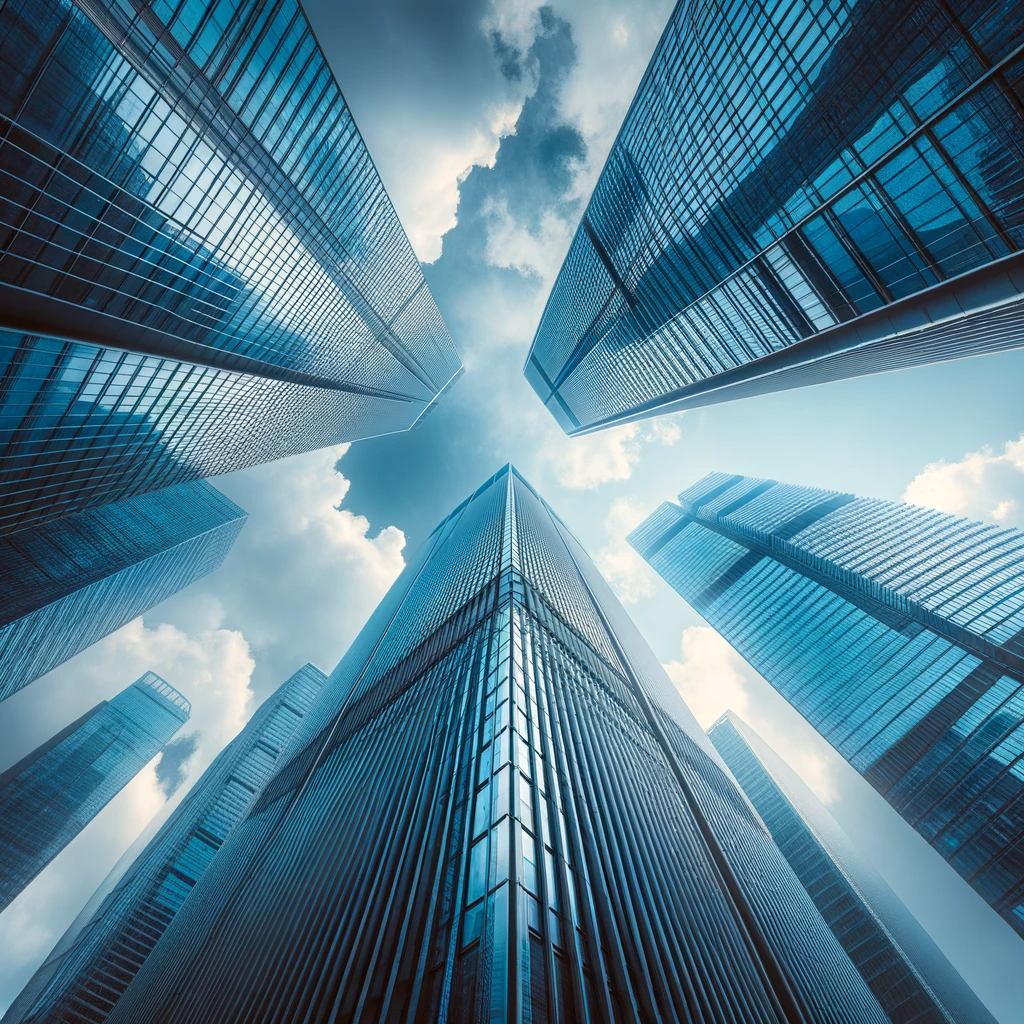 A low-angle view of three skyscrapers covering a large part of the image, with a partially cloudy blue sky visible above. The perspective is like that of a person looking up to see the height of the skyscrapers.