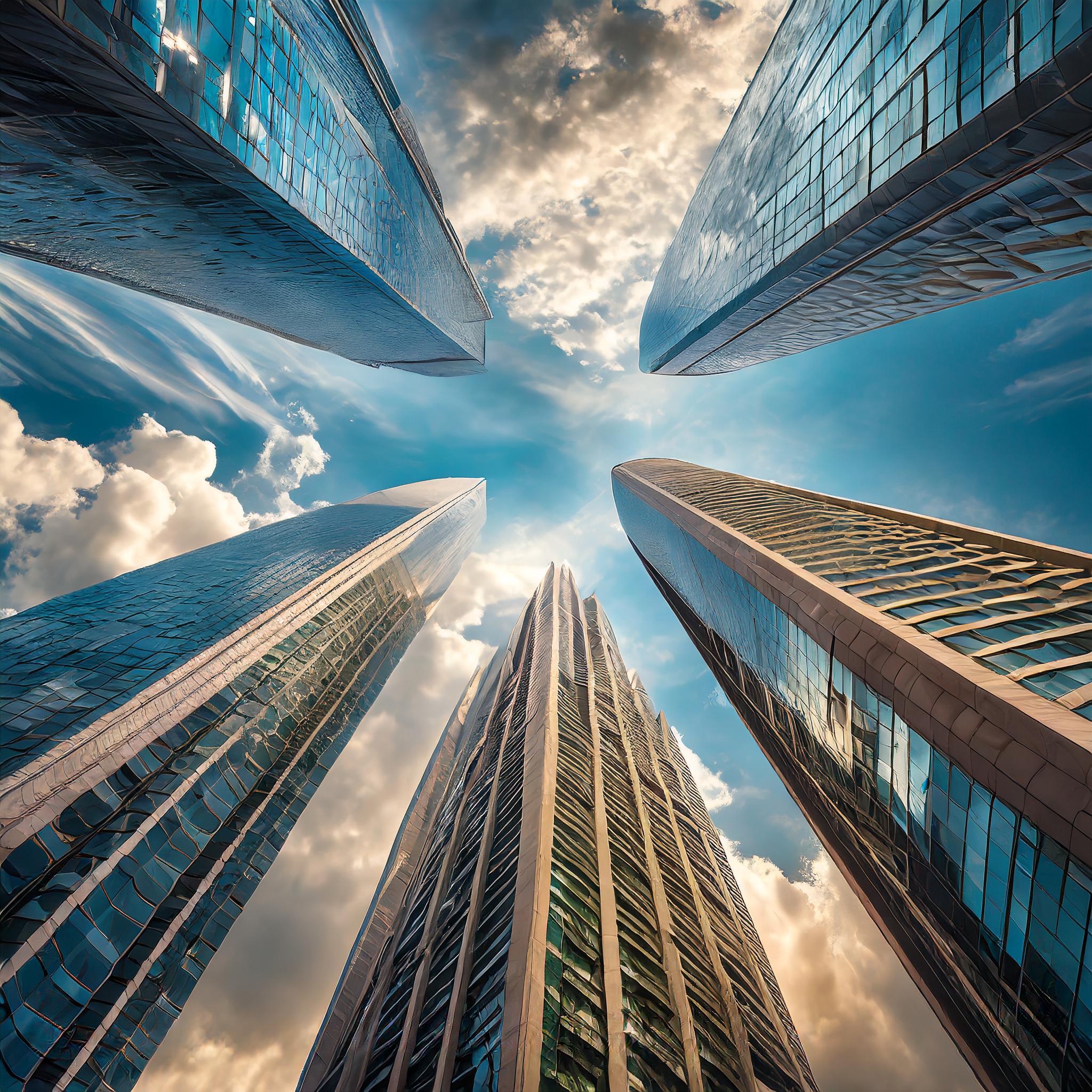 A low-angle view of three skyscrapers covering a large part of the image, with a partially cloudy blue sky visible above. The perspective is like that of a person looking up to see the height of the skyscrapers.
