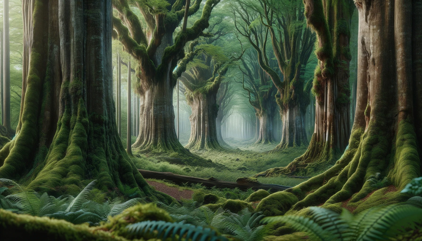 A highly realistic image of the interior of an ancient forest, filled with centenarian trees. These majestic trees have thick, gnarled trunks and a dense canopy of leaves, casting a pattern of light and shadow on the forest floor. The ground is covered with a lush layer of moss, ferns, and fallen leaves, adding to the serene and timeless atmosphere of this old-growth forest.