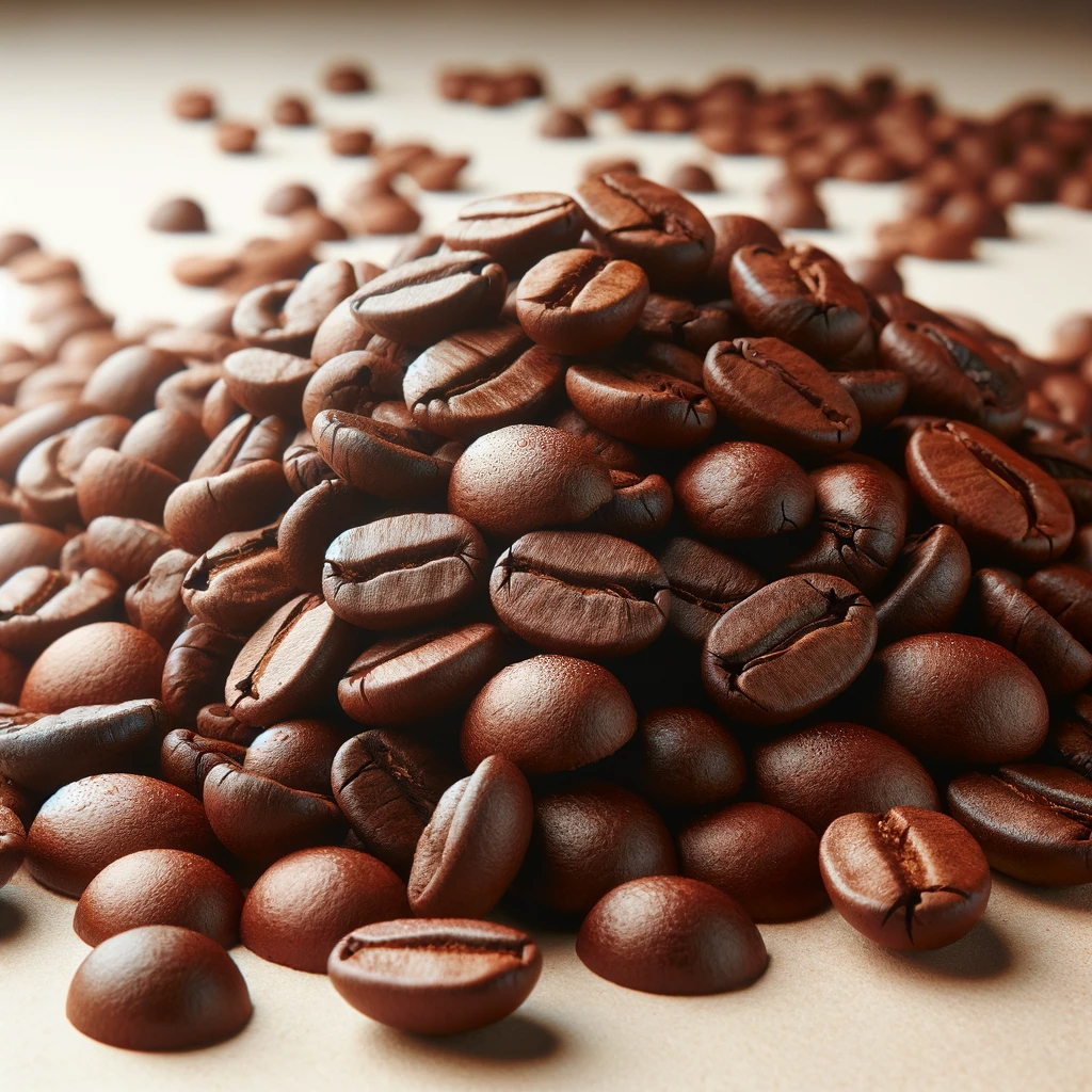 Un gros plan de grains de café amassés les uns sur les autres ; les grains sont d'une belle couleur chocolat brillant.