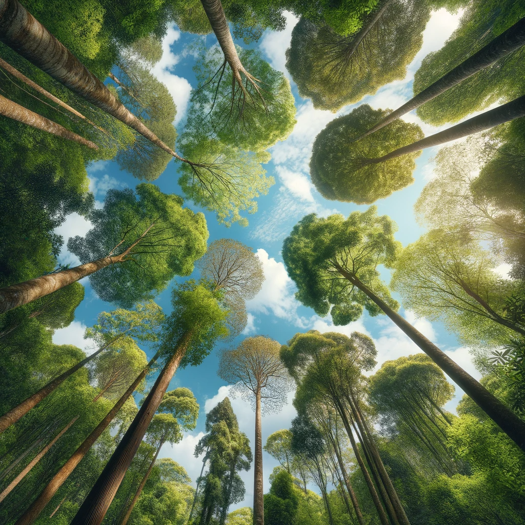 Une vue en contre-plongée de cinq arbres avec un feuillage dense couvrant une grande partie de l'image, donnant l'impression que quelqu'un regarde vers le haut. Le ciel, partiellement nuageux avec une couleur bleu clair, est visible à travers les feuilles. Cette scène ressemble à une belle journée de fin de printemps.