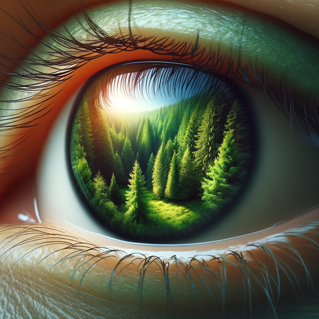 A close-up of an eye reflecting a vast forest. The eye should be detailed, showing vibrant colors and textures, with a sharp focus on the pupil. The reflected forest scene in the eye should be lush and dense, featuring a variety of trees with rich green foliage. The lighting in the forest should suggest a bright, sunny day, casting soft shadows through the trees. The overall image should evoke a sense of mystery and connection with nature.