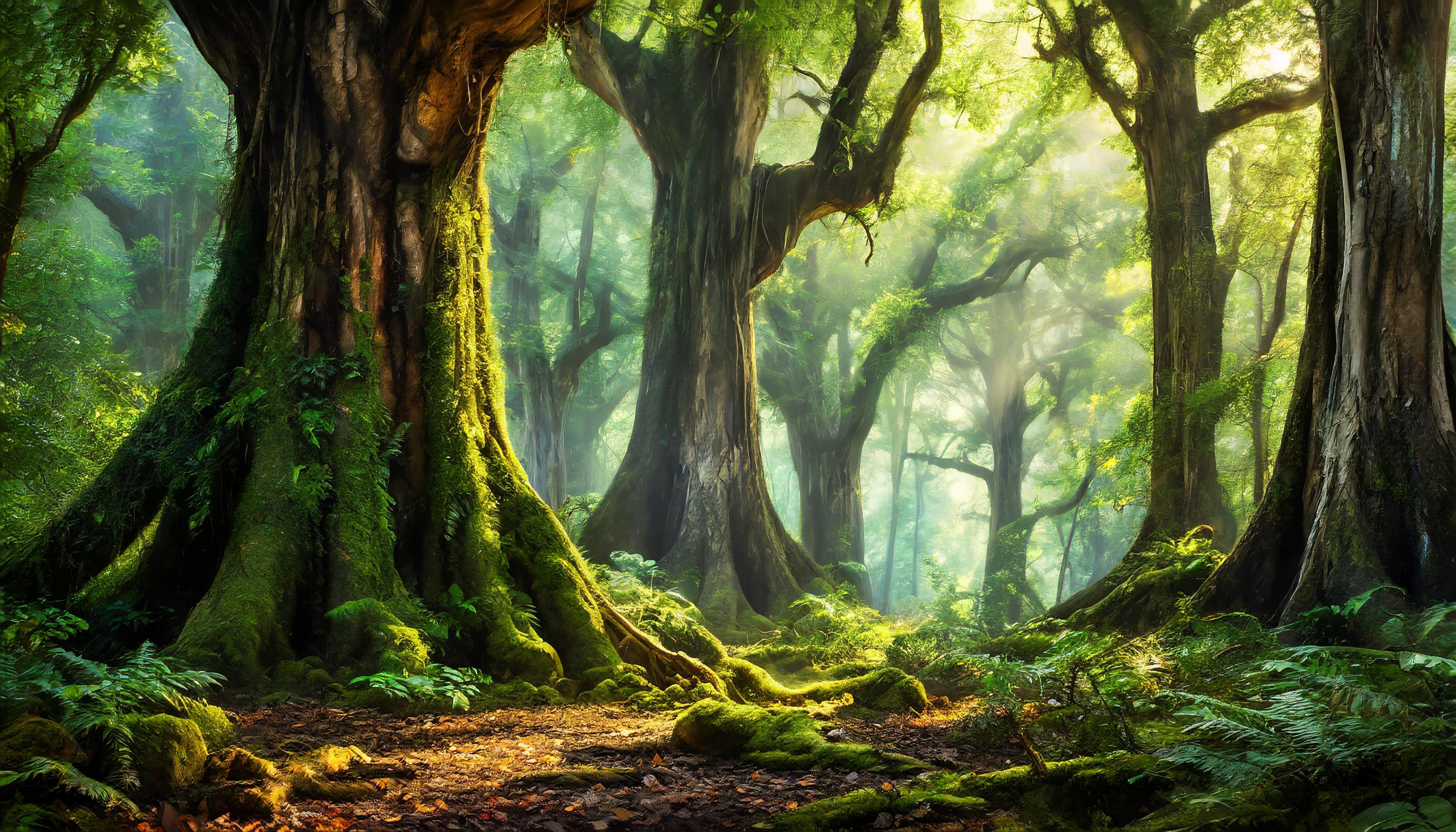 A highly realistic image of the interior of an ancient forest, filled with centenarian trees. These majestic trees have thick, gnarled trunks and a dense canopy of leaves, casting a pattern of light and shadow on the forest floor. The ground is covered with a lush layer of moss, ferns, and fallen leaves, adding to the serene and timeless atmosphere of this old-growth forest.