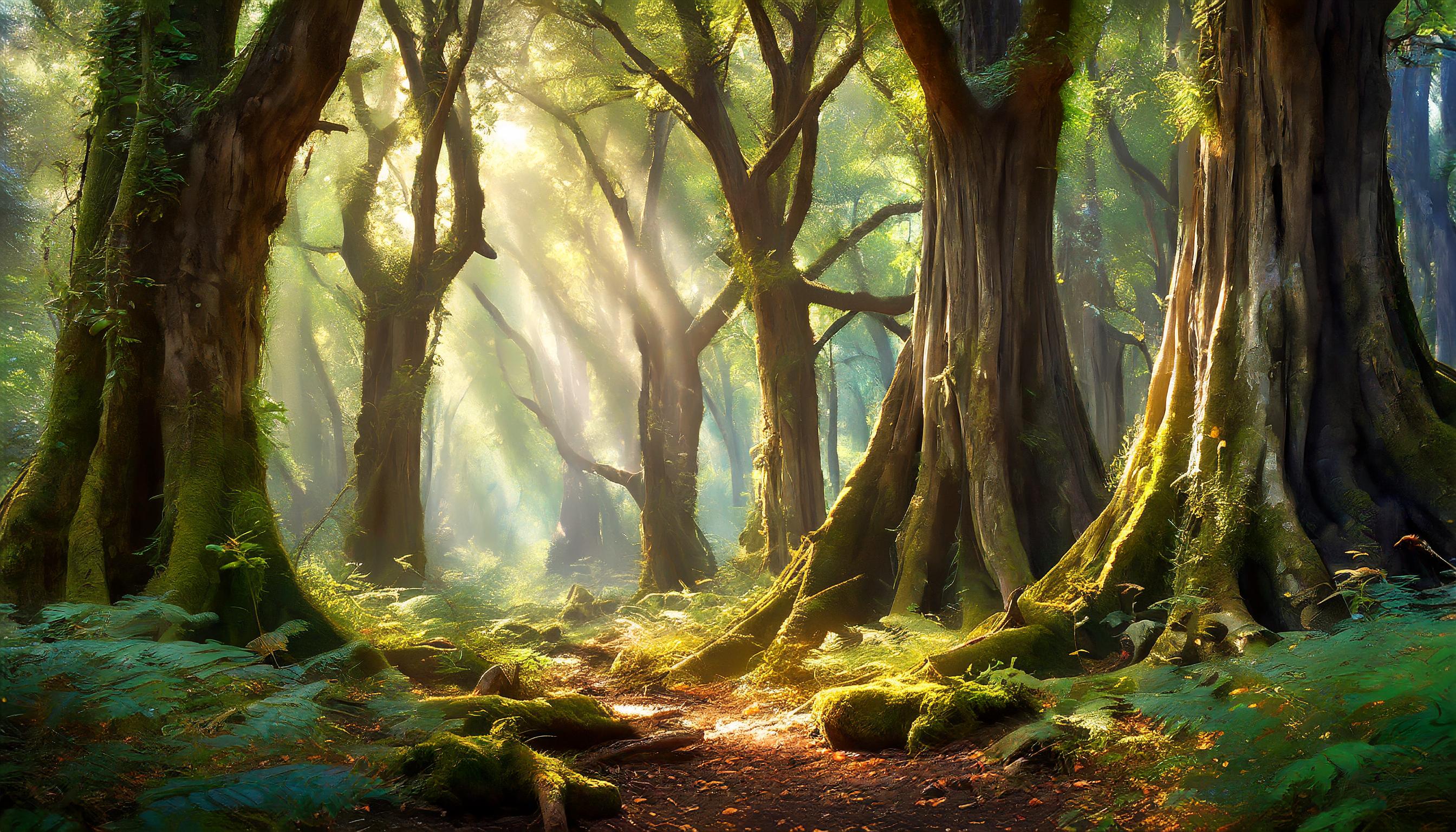 Une image très réaliste de l'intérieur d'une forêt ancienne, remplie d'arbres centenaires. Ces arbres majestueux ont des troncs épais et noueux et une dense canopée de feuilles, projetant un jeu de lumière et d'ombre sur le sol de la forêt. Le sol est recouvert d'une couche luxuriante de mousse, de fougères et de feuilles tombées, contribuant à l'atmosphère sereine et intemporelle de cette forêt ancienne