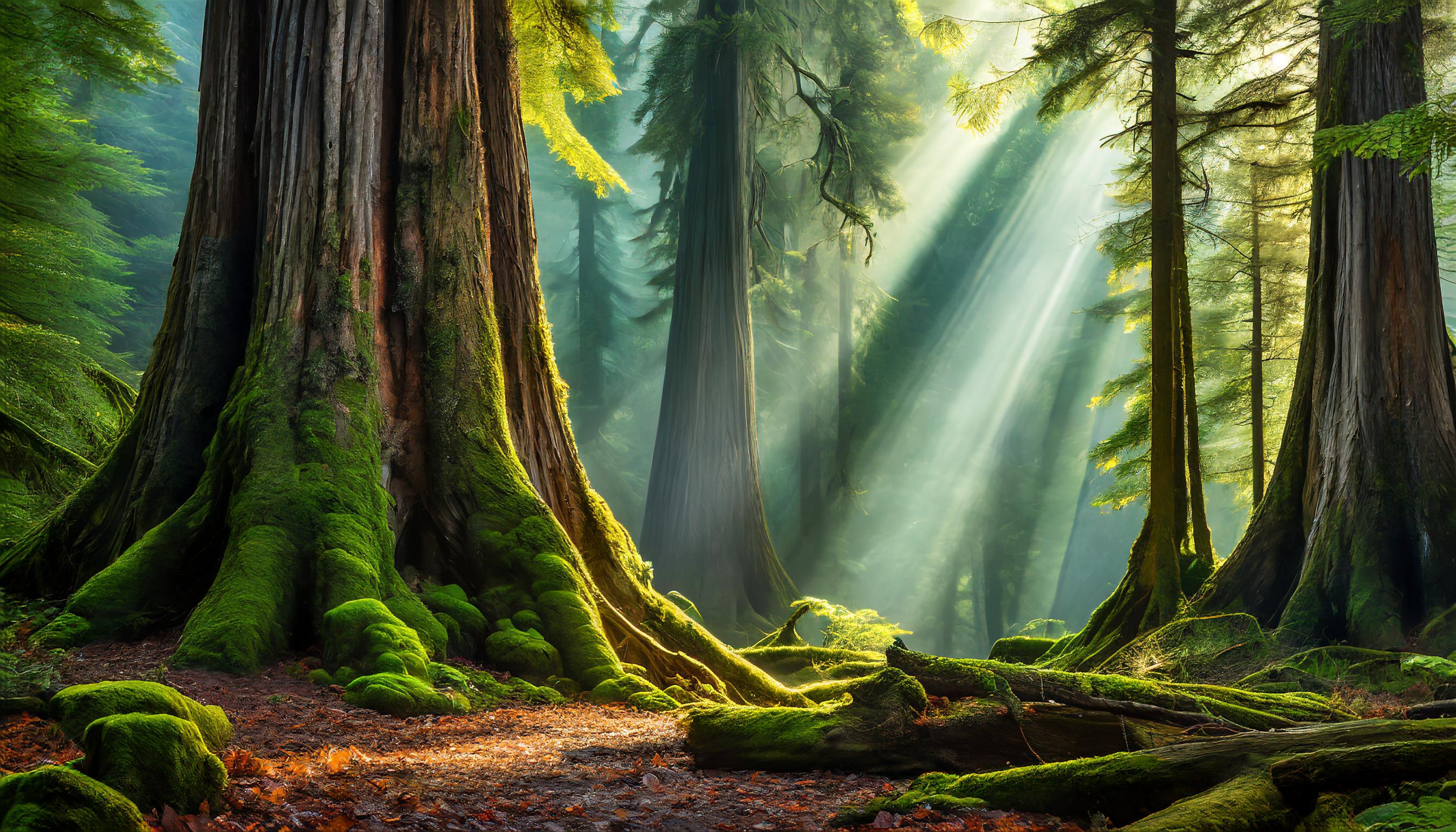 A highly realistic image of the interior of an ancient forest, filled with centenarian trees. These majestic trees have thick, gnarled trunks and a dense canopy of leaves, casting a pattern of light and shadow on the forest floor. The ground is covered with a lush layer of moss, ferns, and fallen leaves, adding to the serene and timeless atmosphere of this old-growth forest.