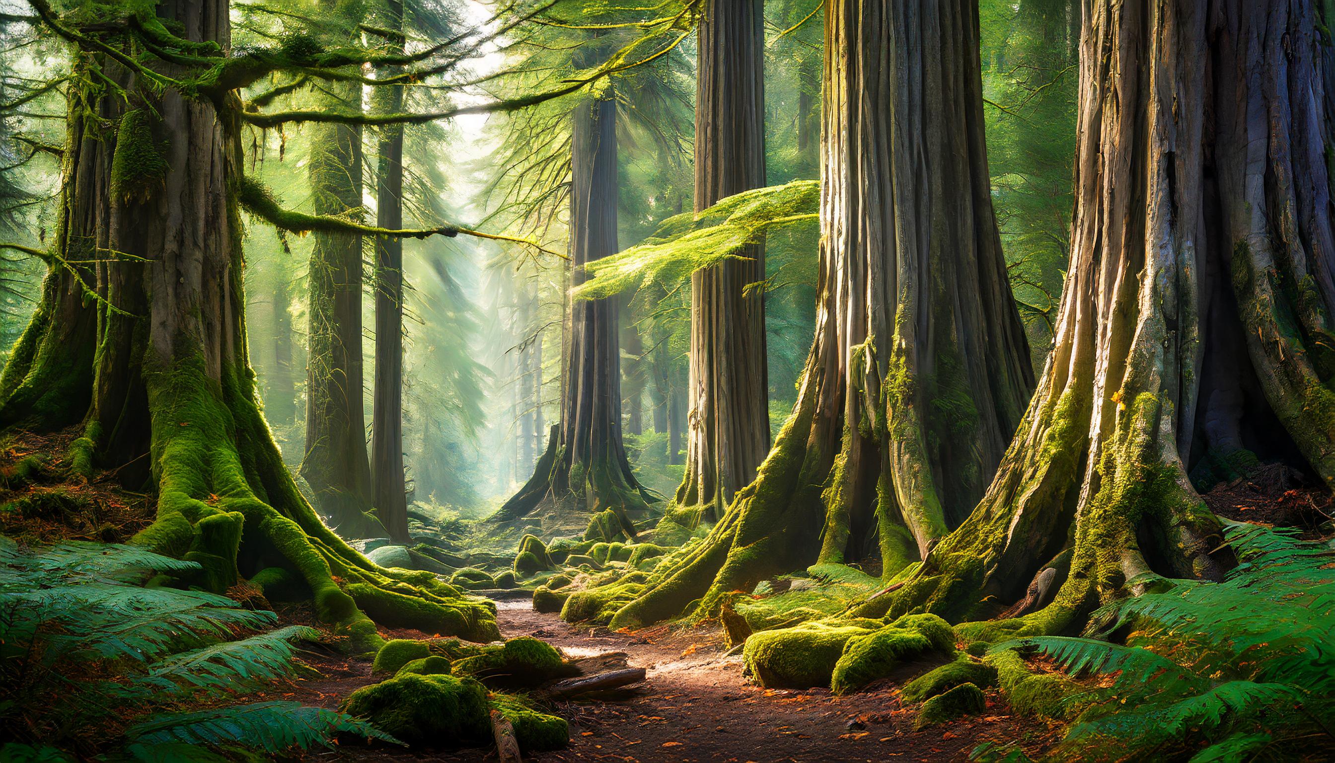 A highly realistic image of the interior of an ancient forest, filled with centenarian trees. These majestic trees have thick, gnarled trunks and a dense canopy of leaves, casting a pattern of light and shadow on the forest floor. The ground is covered with a lush layer of moss, ferns, and fallen leaves, adding to the serene and timeless atmosphere of this old-growth forest.
