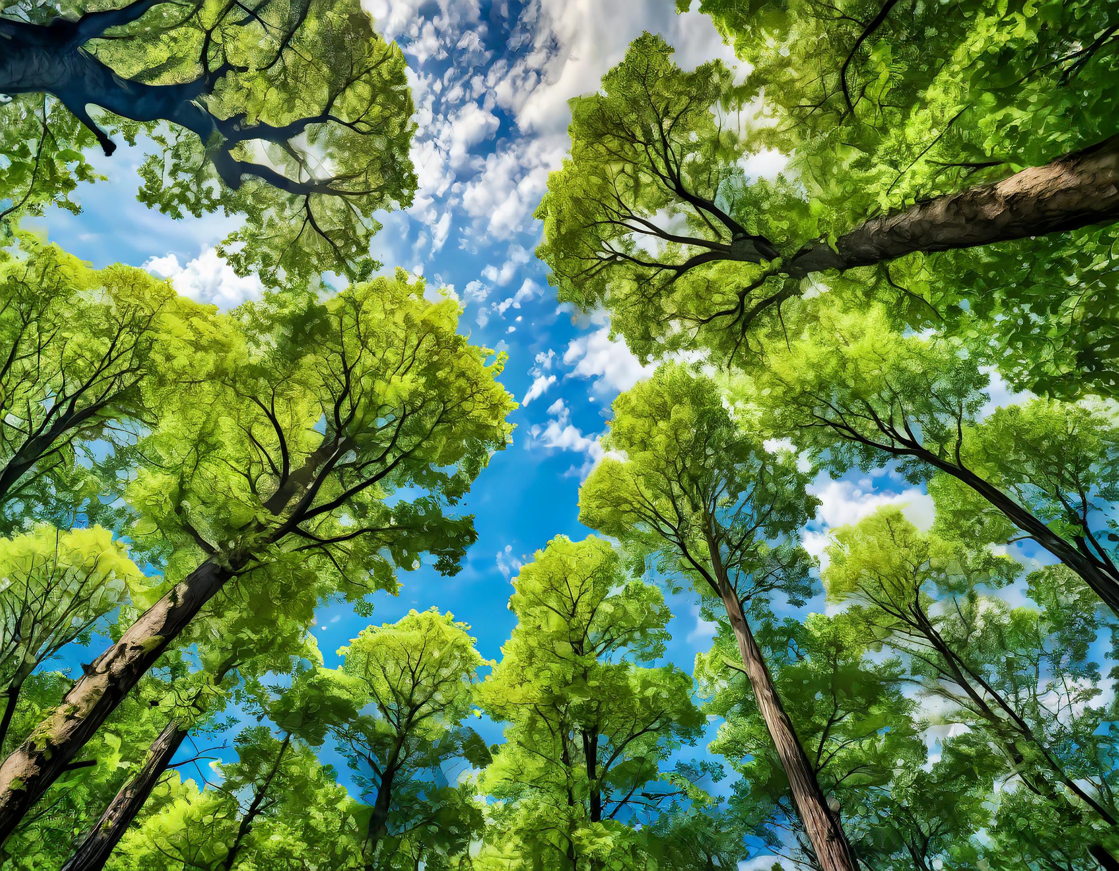 A low-angle view of 10 trees with dense foliage covering a large part of the image, as seen by someone looking up. The sky is visible, partially cloudy with a clear blue color. This scene resembles a beautiful late spring day.