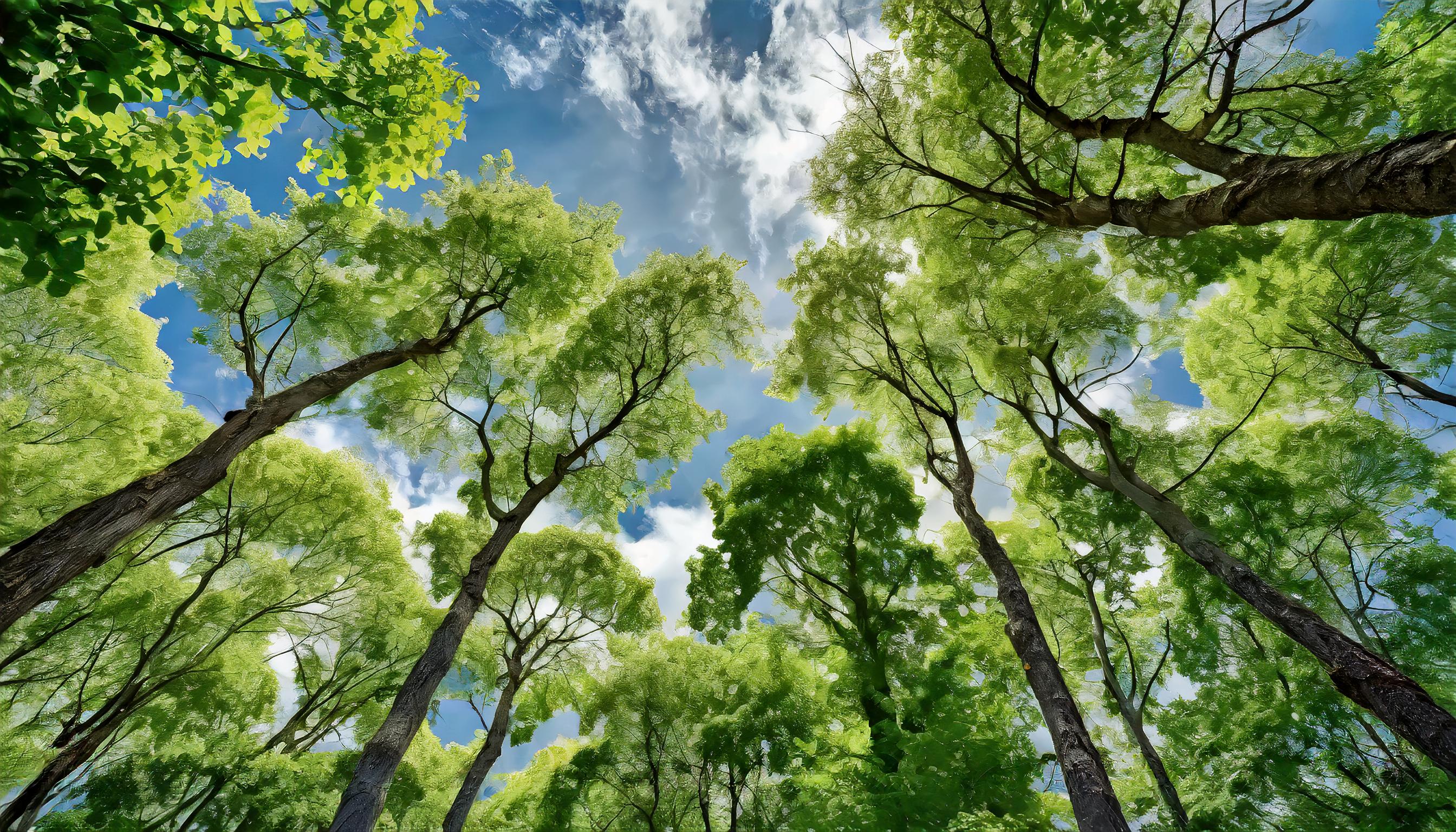 A low-angle view of 10 trees with dense foliage covering a large part of the image, as seen by someone looking up. The sky is visible, partially cloudy with a clear blue color. This scene resembles a beautiful late spring day.