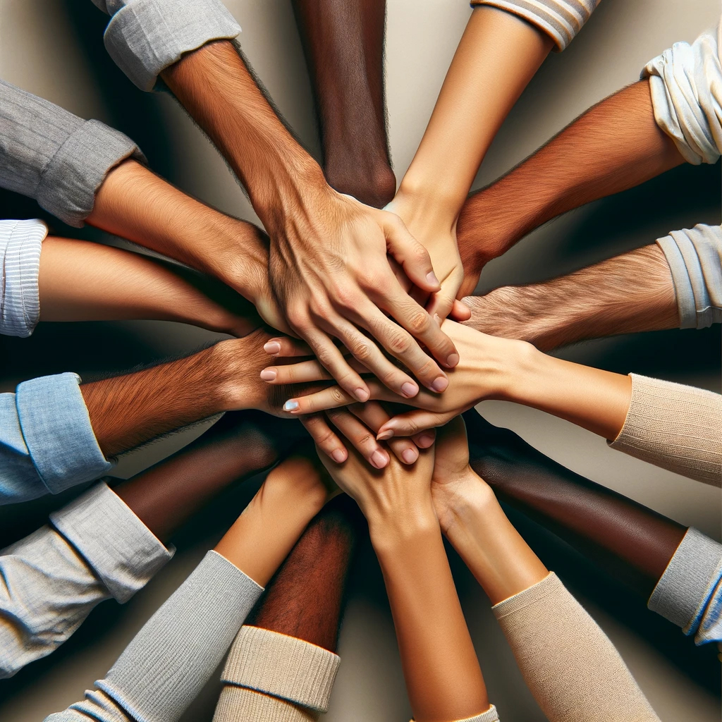At the center of the frame, six hands are stacked on top of each other, with the arms coming from all around the frame, which only allows the forearms and the stacked hands at the center to be seen. This image portrays a sense of teamwork and mutual support, with varied skin tones among the hands to reflect diversity and unity. The background is deliberately neutral to emphasize the central motif of connectedness and shared effort.