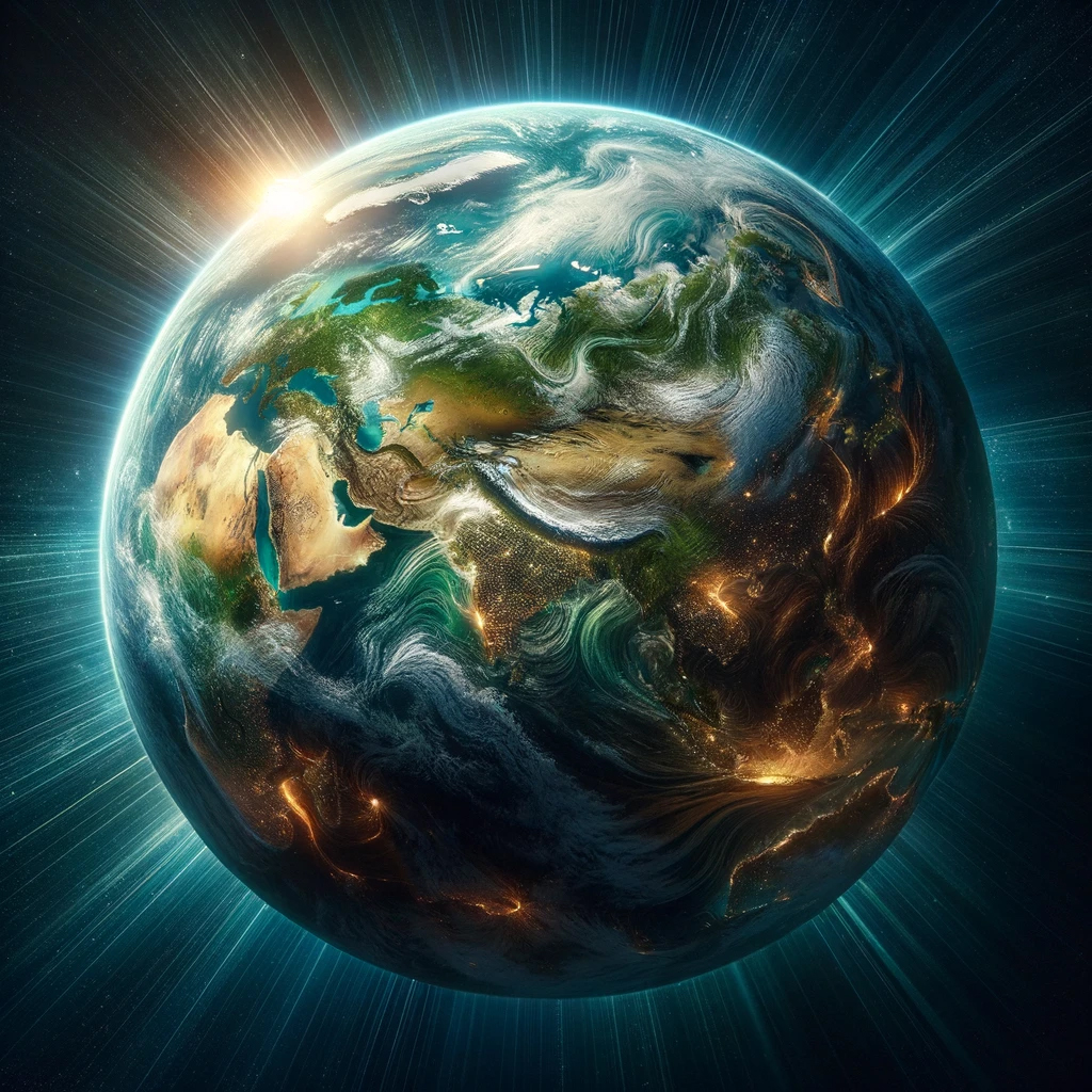 Vue de l'espace, la Terre est représentée comme un disque plat où l'on peut y voir les continents et océans, vue de 3/4