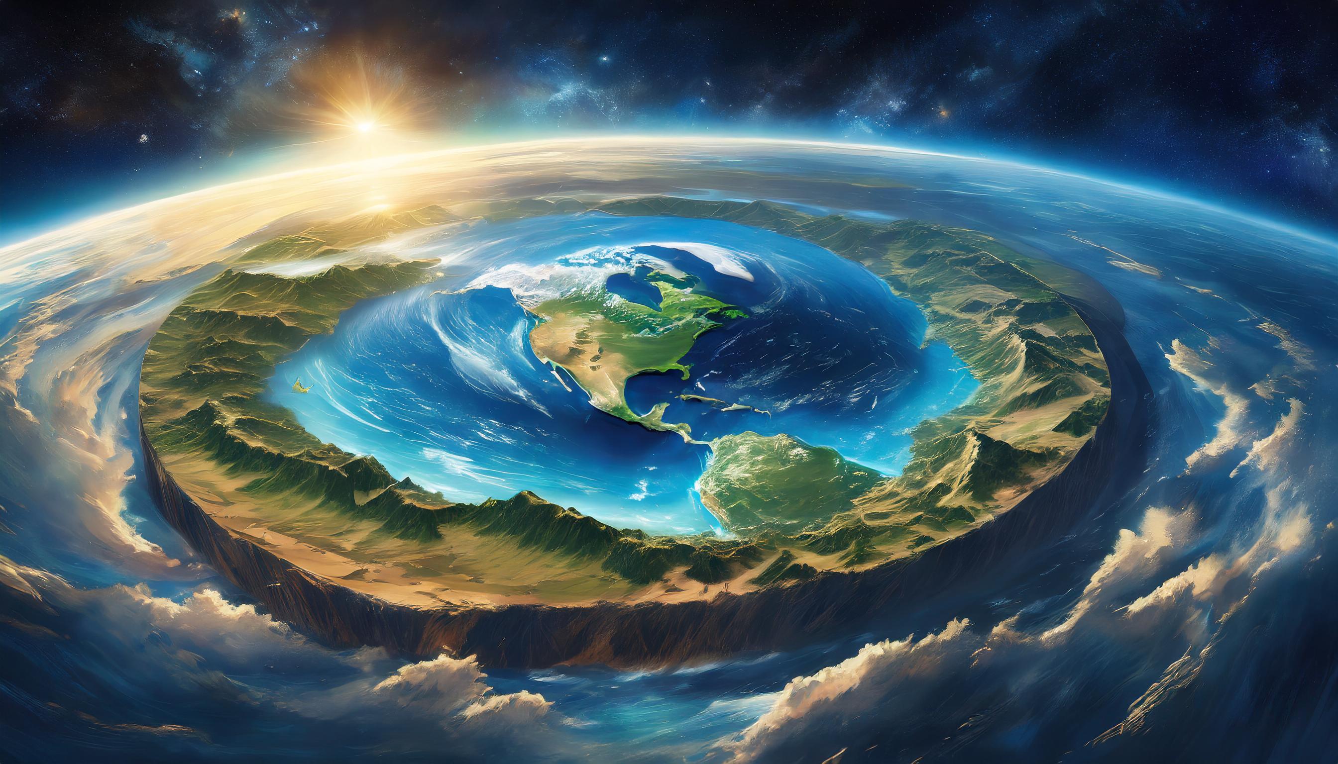From space, the Earth is depicted as a flat disc where one can see the continents and oceans.