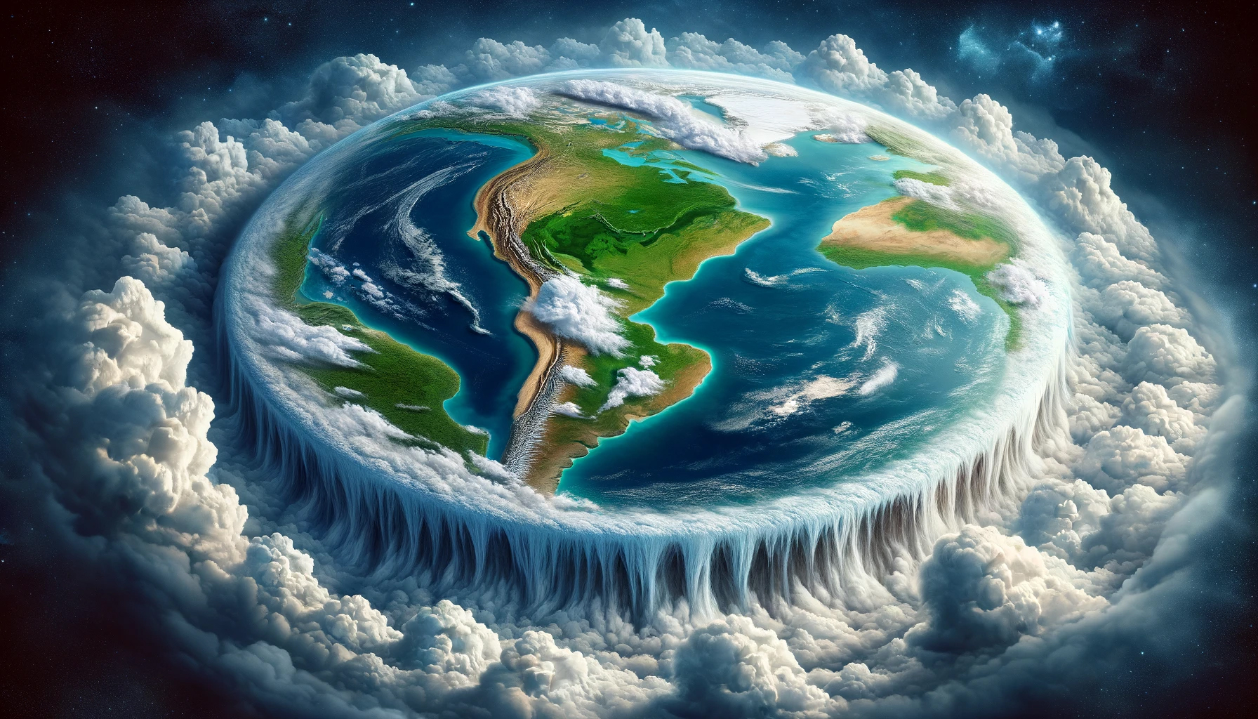 Vue de l'espace, la Terre est représentée comme un disque plat, vu de côté, avec des reliefs, un ciel nuageux et, au bord du disque, la mer qui déborde. La scène capture la nature fantastique du concept de la Terre plate, avec un accent sur le contraste surréaliste entre la Terre ronde connue et cette représentation imaginative. Le disque est détaillé avec des masses terrestres vertes, des chaînes de montagnes et des rivières, entouré par une vaste mer bleue qui se déverse sur les bords comme une cascade. Au-dessus, le ciel est un mélange de blanc et de bleu, parsemé de nuages duveteux, complétant ce paysage d'un autre monde.