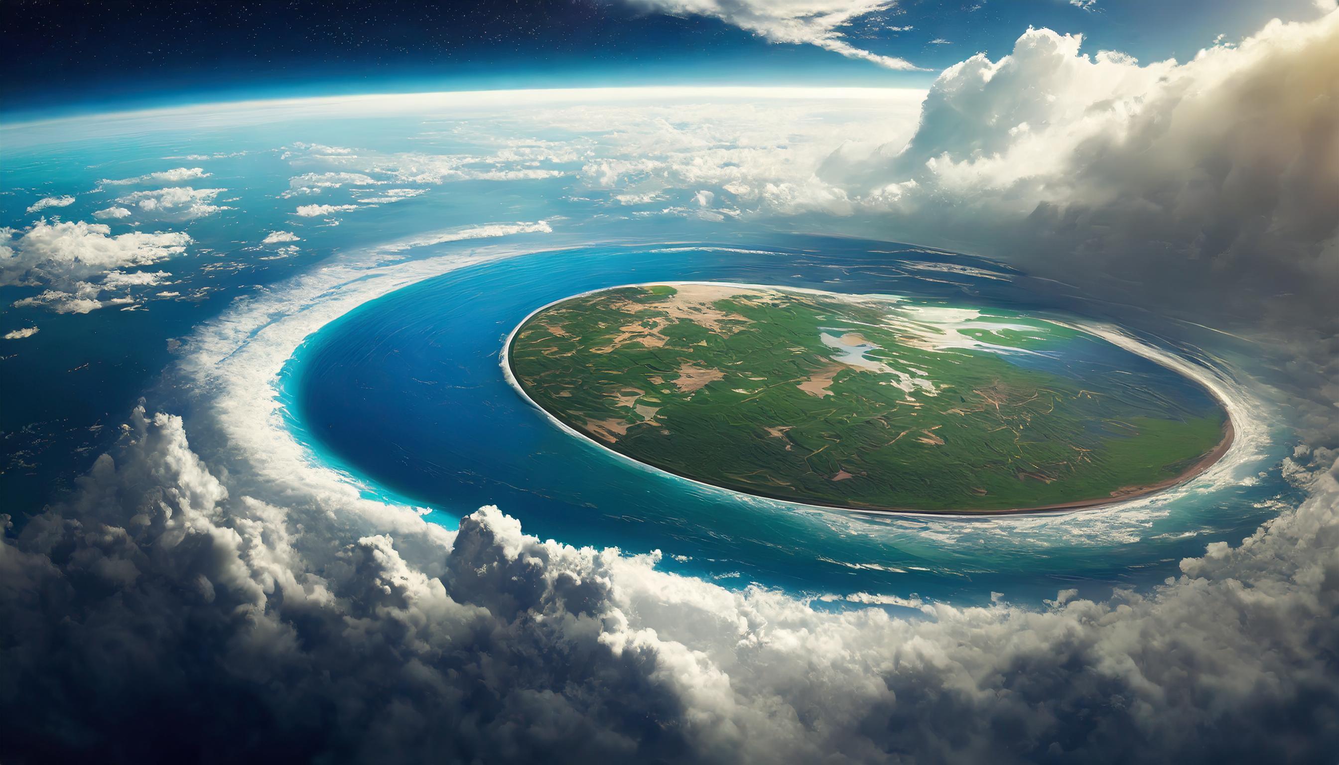 Vue de l'espace, la Terre est représentée comme un disque plat, vu de côté, avec des reliefs, un ciel nuageux et, au bord du disque, la mer qui déborde. La scène capture la nature fantastique du concept de la Terre plate, avec un accent sur le contraste surréaliste entre la Terre ronde connue et cette représentation imaginative. Le disque est détaillé avec des masses terrestres vertes, des chaînes de montagnes et des rivières, entouré par une vaste mer bleue qui se déverse sur les bords comme une cascade. Au-dessus, le ciel est un mélange de blanc et de bleu, parsemé de nuages duveteux, complétant ce paysage d'un autre monde.