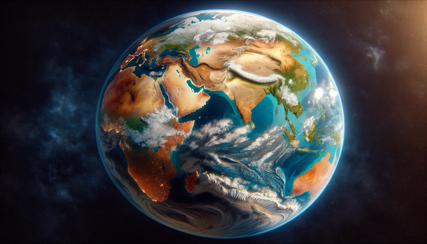 Une vue de l'espace, représentant la Terre comme une sphère où les continents et les océans sont clairement visibles. Les continents sont montrés avec des couleurs réalistes, représentant divers terrains tels que des déserts, des forêts et des montagnes, tandis que les océans sont dépeints dans différentes nuances de bleu pour indiquer la profondeur. Des formations de nuages peuvent être vues éparpillées à travers la planète, ajoutant au réalisme de la scène. Cette image capture la beauté et la diversité de la Terre depuis une perspective spatiale.