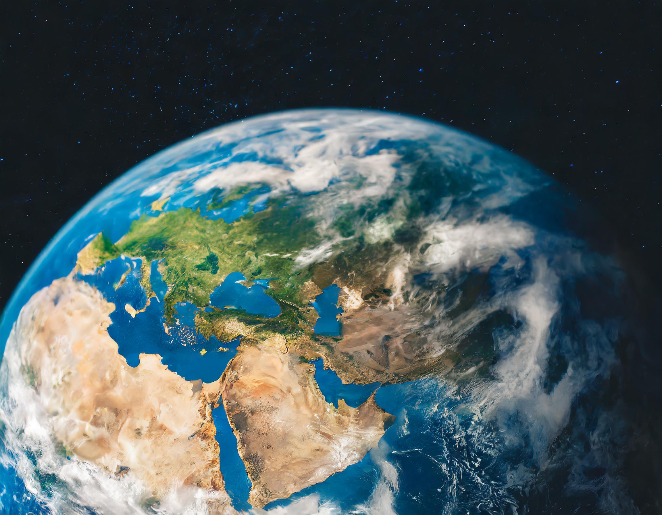 Une vue de l'espace, représentant la Terre comme une sphère où les continents et les océans sont clairement visibles. Les continents sont affichés avec des couleurs réalistes, représentant divers terrains tels que les déserts, les forêts et les montagnes, tandis que les océans sont dépeints dans différentes nuances de bleu pour indiquer la profondeur. Des formations de nuages peuvent être observées dispersées à travers la planète, ajoutant au réalisme de la scène. Cette image saisit la beauté et la diversité de la Terre depuis une perspective spatiale extérieure.