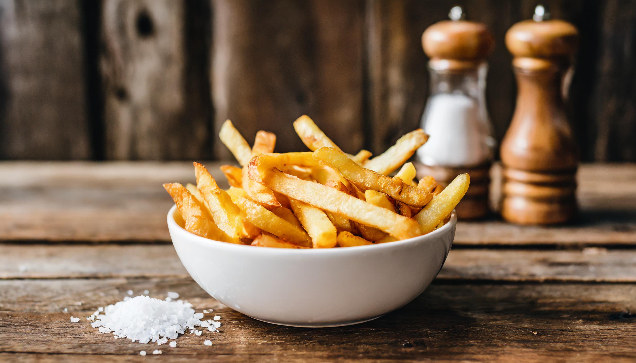 Une vue de près met en avant une vieille table en bois sur laquelle se trouve un bol blanc rempli de frites, disposées avec soin pour ne pas déborder. Les seuls autres éléments visibles sur la table sont des grains de sel gros et une poivrière, mettant en avant un cadre minimaliste. Il n'y a rien d'autre sur la table, focalisant toute l'attention sur le bol de frites, le sel et le poivre. Cette composition souligne la simplicité et l'élégance rustique de la scène, la texture de la table en bois ajoutant de la profondeur et du caractère.