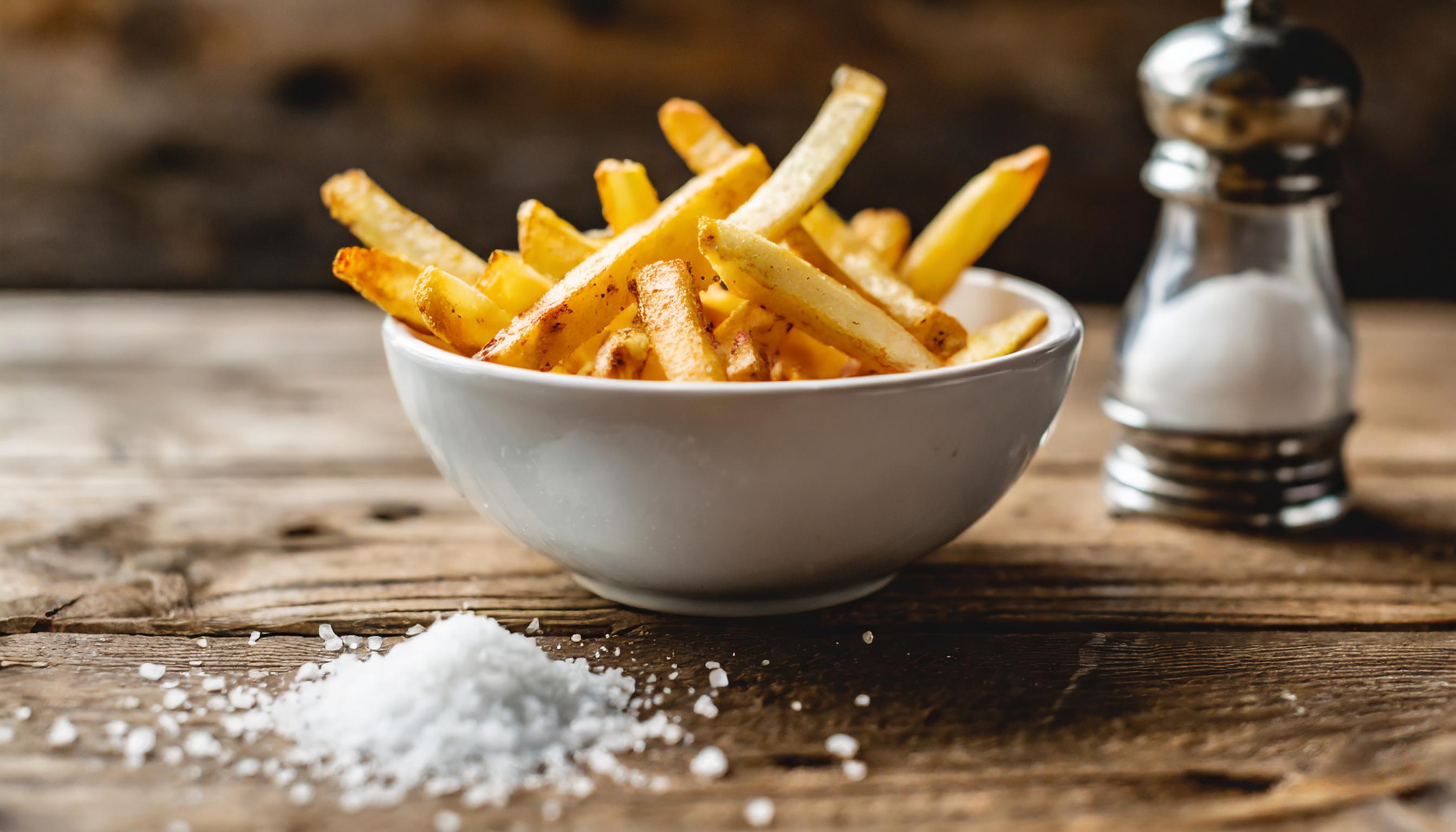 A close-up view showcases an old wooden table with a white bowl filled with fries, carefully placed to not overflow. The only other items visible on the table are grains of coarse salt and a pepper shaker, emphasizing a minimalist setting. There is nothing else on the table, focusing all attention on the bowl of fries, the salt, and the pepper. This composition highlights the simplicity and rustic elegance of the scene, with the wooden table's texture adding depth and character.