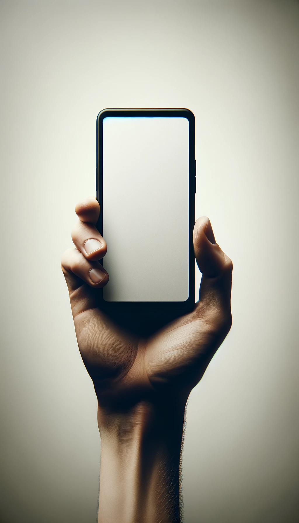 Créer une image d'une main tenant un smartphone face directement au spectateur. Le smartphone doit être centré et l'écran entier doit être visible et blanc, sans aucun autre contenu ou applications affichés. La main est positionnée comme si elle montrait le téléphone à quelqu'un, et l'arrière-plan doit être neutre et sans description pour garder le focus sur le smartphone.