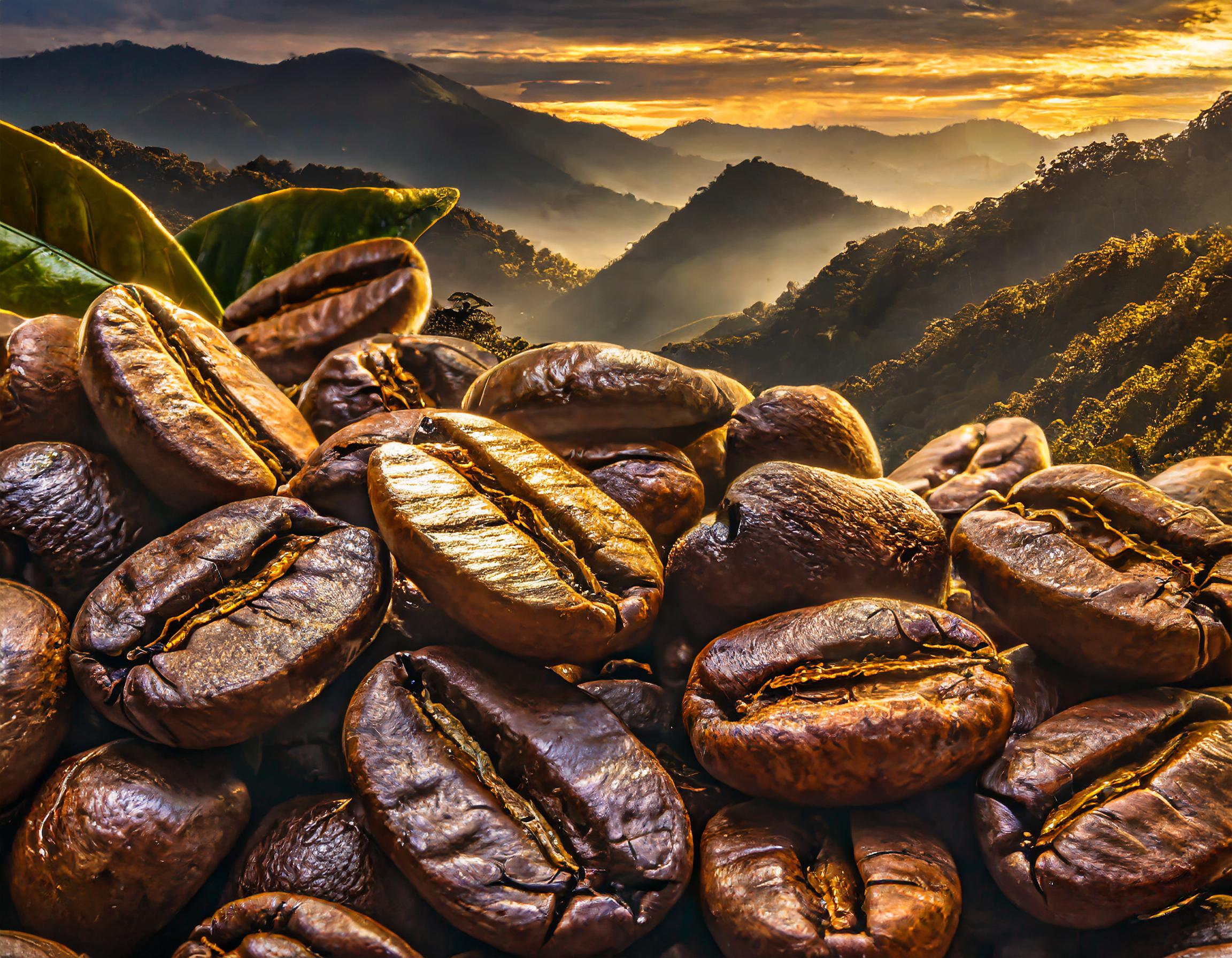 Un gros plan de grains de café empilés les uns sur les autres, avec des grains de café couvrant entièrement le cadre. L'accent est mis sur la texture et la variété des grains, mettant en avant leurs couleurs marron riches et le brillant luisant de certains grains. Cette image devrait capturer l'essence de grains de café fraîchement torréfiés, soulignant les détails tels que les légères variations de taille et de couleur parmi les grains. L'éclairage devrait mettre en valeur les contours et les ombres des grains, ajoutant de la profondeur et de la dimension à la composition.