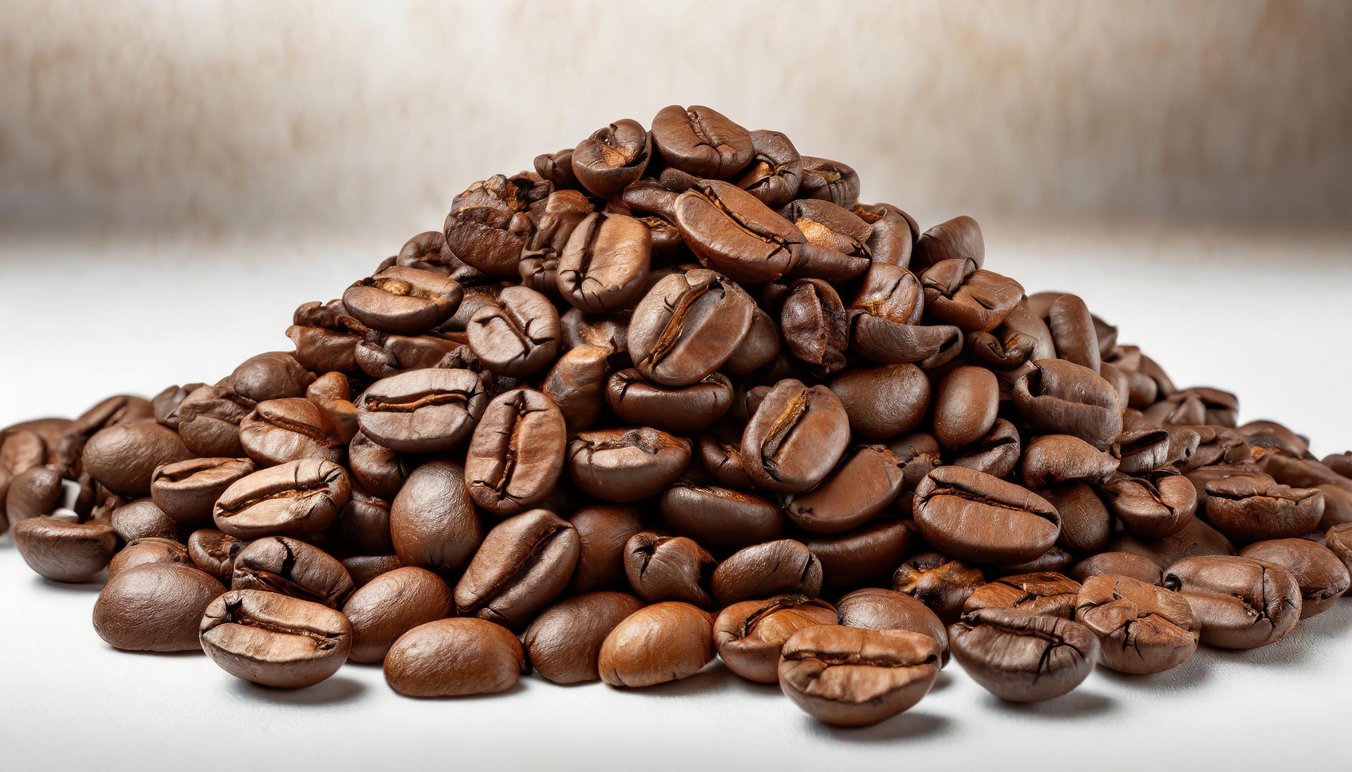 Un tas de grains de café empilés les uns sur les autres au milieu du cadre, avec un fond complètement blanc, uniforme sans aucun ombrage. L'accent est mis sur la texture et le détail des grains de café, mettant en évidence leurs couleurs marron riches et la manière dont ils s'imbriquent et s'empilent. La composition est simple et minimaliste, soulignant la beauté naturelle des grains de café contre le fond blanc éclatant. L'éclairage est doux, projetant des ombres légères et améliorant les contours de chaque grain pour un contraste frappant.