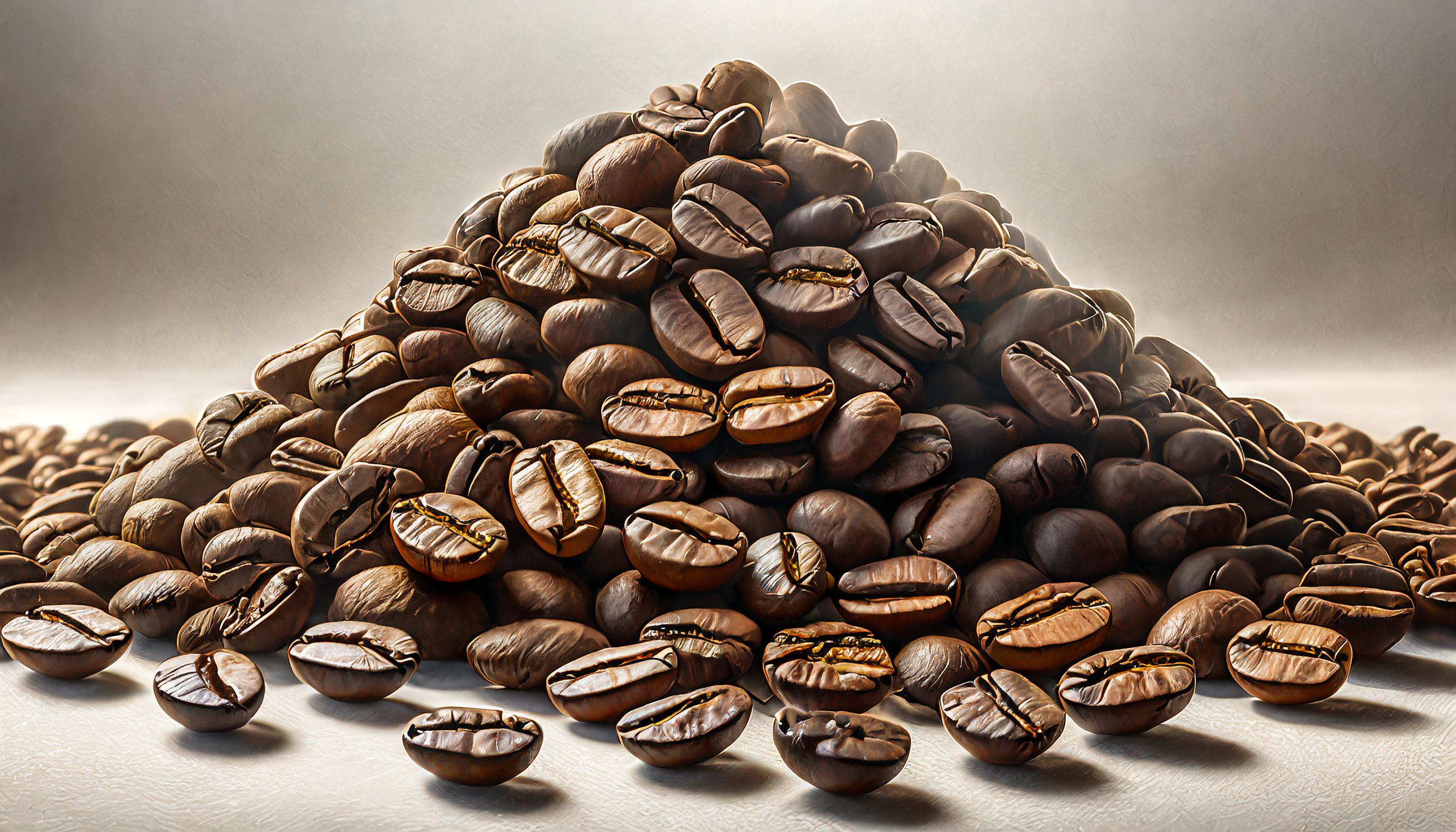 A heap of coffee beans piled on top of each other in the middle of the frame, with a completely white, uniform background without any shading. The focus is on the texture and detail of the coffee beans, highlighting their rich brown colors and the way they interlock and stack. The composition is simple and minimalist, emphasizing the natural beauty of the coffee beans against the stark white backdrop. The lighting is soft, casting gentle shadows and enhancing the contours of each bean for a striking contrast.