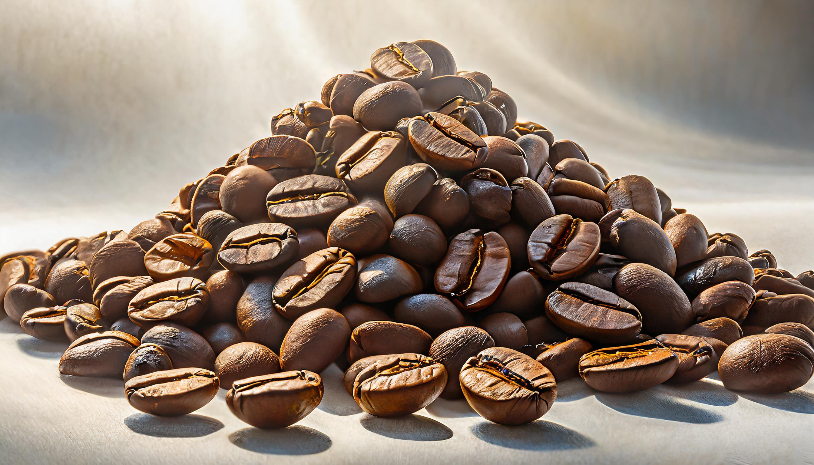 Un tas de grains de café empilés les uns sur les autres au milieu du cadre, avec un fond complètement blanc, uniforme sans aucun ombrage. L'accent est mis sur la texture et le détail des grains de café, mettant en évidence leurs couleurs marron riches et la manière dont ils s'imbriquent et s'empilent. La composition est simple et minimaliste, soulignant la beauté naturelle des grains de café contre le fond blanc éclatant. L'éclairage est doux, projetant des ombres légères et améliorant les contours de chaque grain pour un contraste frappant.