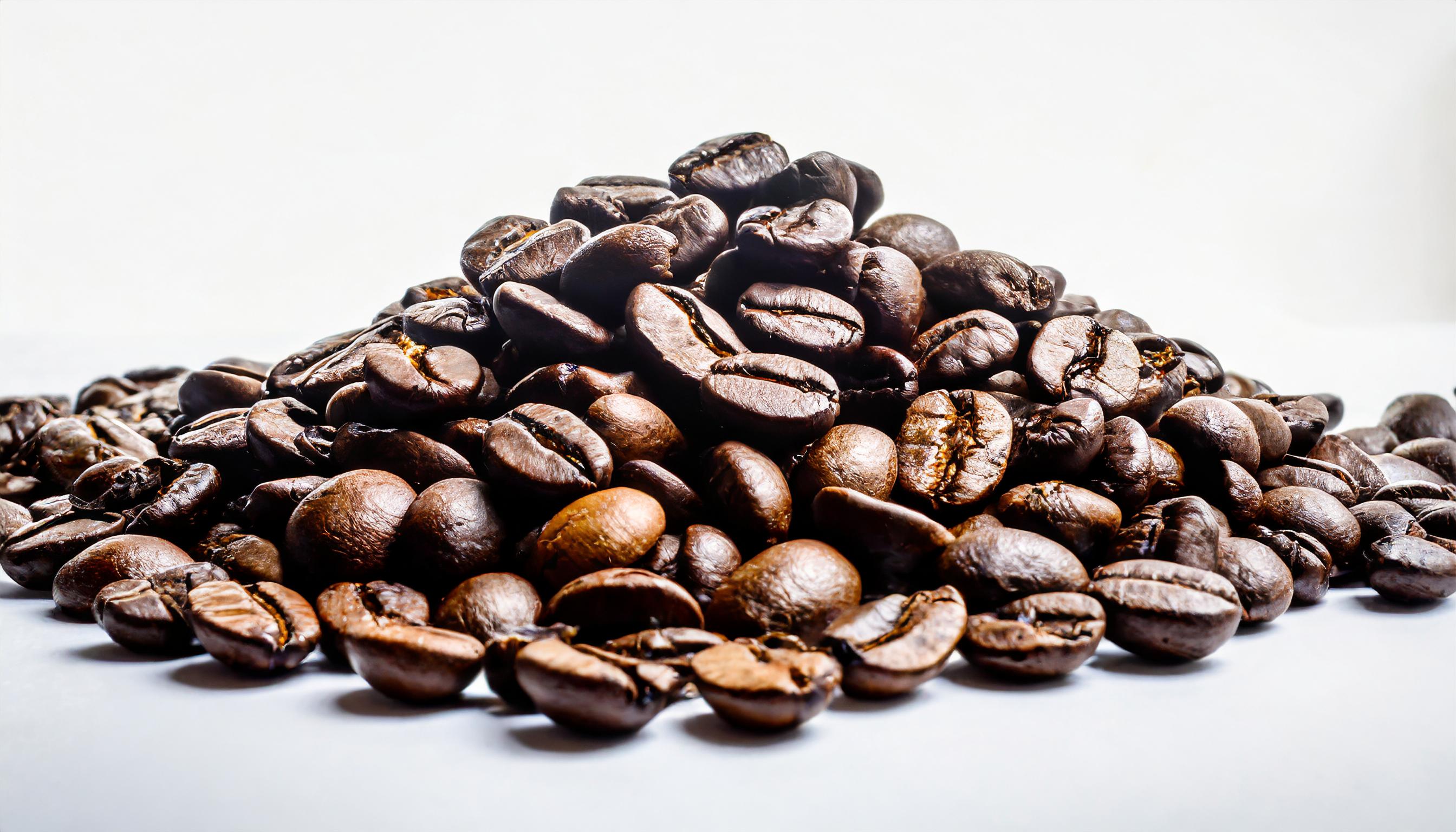 Un tas de grains de café empilés les uns sur les autres au milieu du cadre, avec un fond complètement blanc, uniforme sans aucun ombrage. L'accent est mis sur la texture et le détail des grains de café, mettant en évidence leurs couleurs marron riches et la manière dont ils s'imbriquent et s'empilent. La composition est simple et minimaliste, soulignant la beauté naturelle des grains de café contre le fond blanc éclatant. L'éclairage est doux, projetant des ombres légères et améliorant les contours de chaque grain pour un contraste frappant.