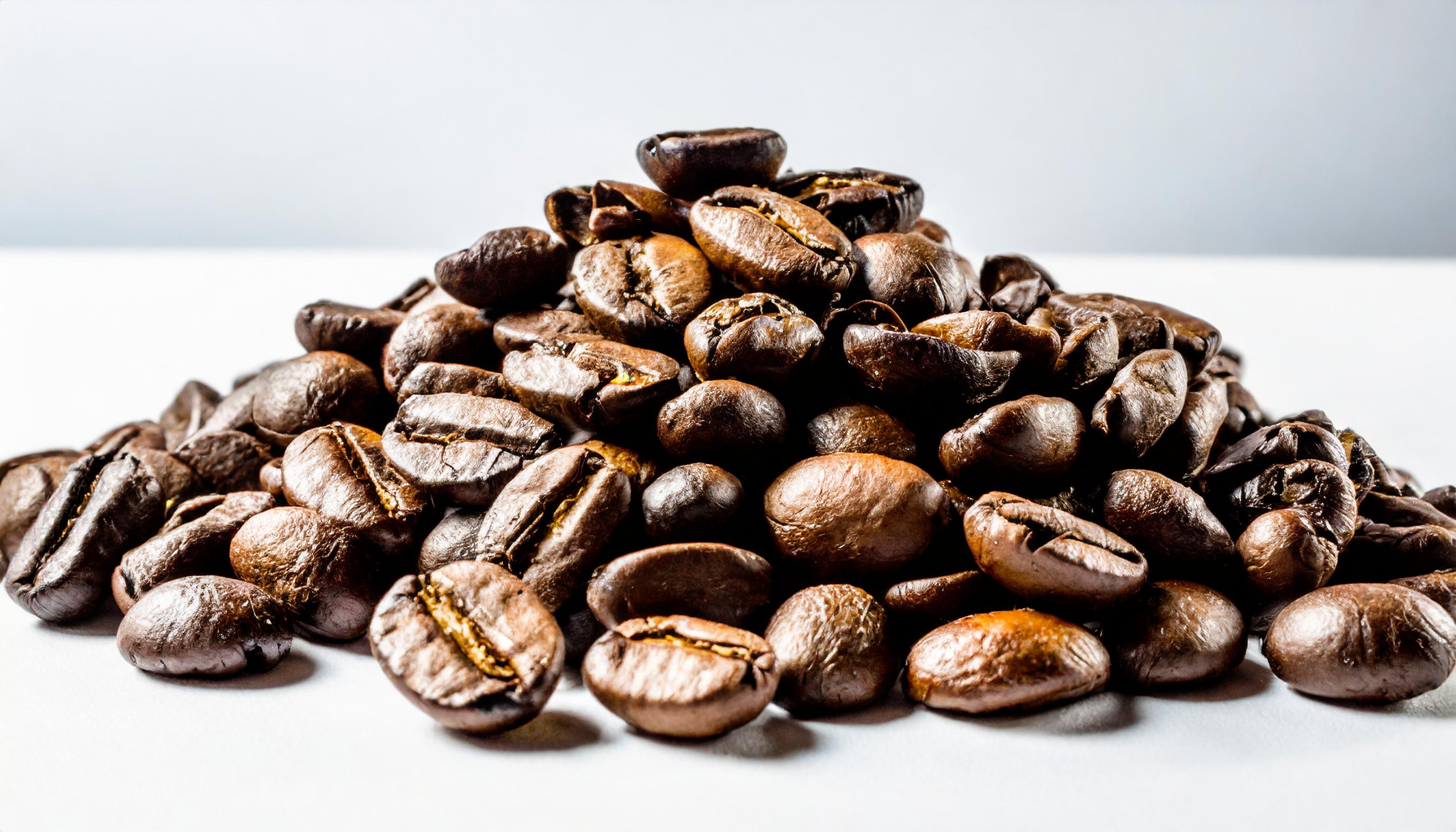 Un tas de grains de café empilés les uns sur les autres au milieu du cadre, avec un fond complètement blanc, uniforme sans aucun ombrage. L'accent est mis sur la texture et le détail des grains de café, mettant en évidence leurs couleurs marron riches et la manière dont ils s'imbriquent et s'empilent. La composition est simple et minimaliste, soulignant la beauté naturelle des grains de café contre le fond blanc éclatant. L'éclairage est doux, projetant des ombres légères et améliorant les contours de chaque grain pour un contraste frappant.