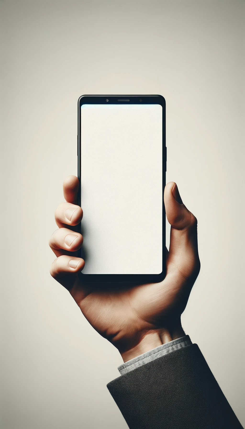 Créer une image d'une main tenant un smartphone avec la face avant tournée vers le spectateur. Le smartphone doit être centré dans la composition, et tout l'écran doit être visible et blanc, sans icônes ni images, suggérant un affichage vide. La main doit sembler présenter le téléphone, et l'arrière-plan doit être discret et neutre pour éviter de distraire du smartphone.
