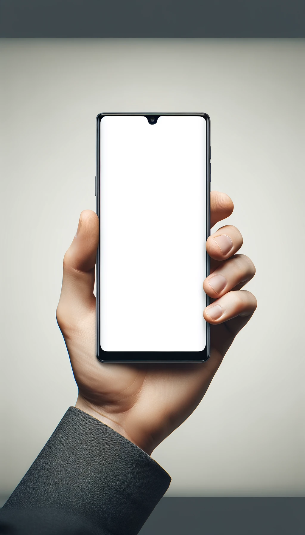 Générer une image d'une main tenant un smartphone directement vers le spectateur. L'écran entier du smartphone doit être visible et complètement blanc, sans texte, images ou icônes. Le smartphone doit être de conception moderne avec un cadre étroit. La main présente le téléphone avec l'écran occupant la majeure partie de la zone de l'image, et l'arrière-plan doit être simple et épuré pour maintenir l'accent sur le smartphone.