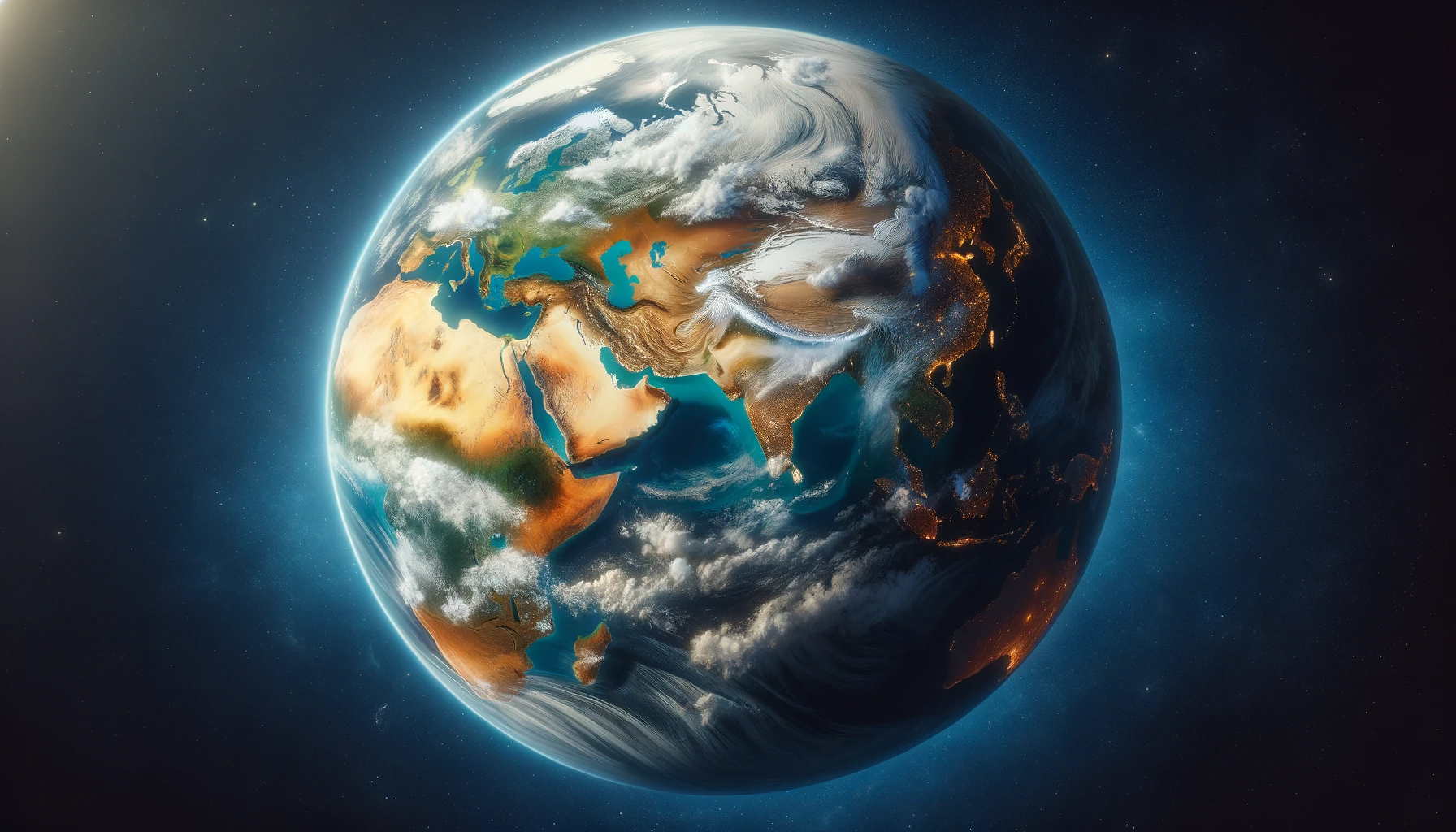 Une vue de l'espace, représentant la Terre comme une sphère où les continents et les océans sont clairement visibles. Les continents sont montrés avec des couleurs réalistes, représentant divers terrains tels que des déserts, des forêts et des montagnes, tandis que les océans sont dépeints dans différentes nuances de bleu pour indiquer la profondeur. Des formations de nuages peuvent être vues éparpillées à travers la planète, ajoutant au réalisme de la scène. Cette image capture la beauté et la diversité de la Terre depuis une perspective spatiale.
