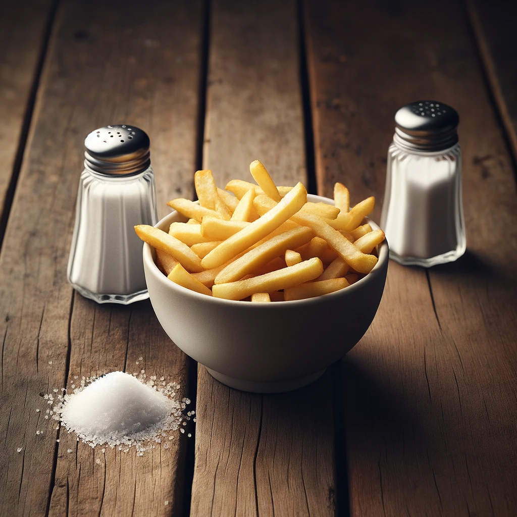 A close-up view showcases an old wooden table with a white bowl filled with fries, carefully placed to not overflow. The only other items visible on the table are grains of coarse salt and a pepper shaker, emphasizing a minimalist setting. There is nothing else on the table, focusing all attention on the bowl of fries, the salt, and the pepper. This composition highlights the simplicity and rustic elegance of the scene, with the wooden table's texture adding depth and character.