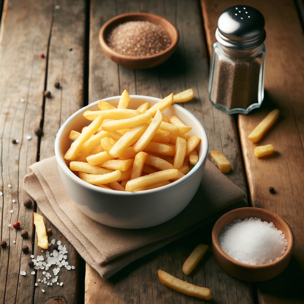 Un gros plan sur une vieille table en bois présente un bol blanc rempli de frites, positionné de manière à ce qu'elles ne débordent pas. Sont visibles sur la table des grains de gros sel et une poivrière, mais il est notable qu'aucune frite n'est éparpillée sur la table elle-même, et aucun autre objet n'est présent. Cette scène met l'accent sur un cadre concentré et minimaliste, soulignant le charme rustique de la table en bois et l'arrangement simple, mais attrayant du bol avec les frites, le sel et le poivre.