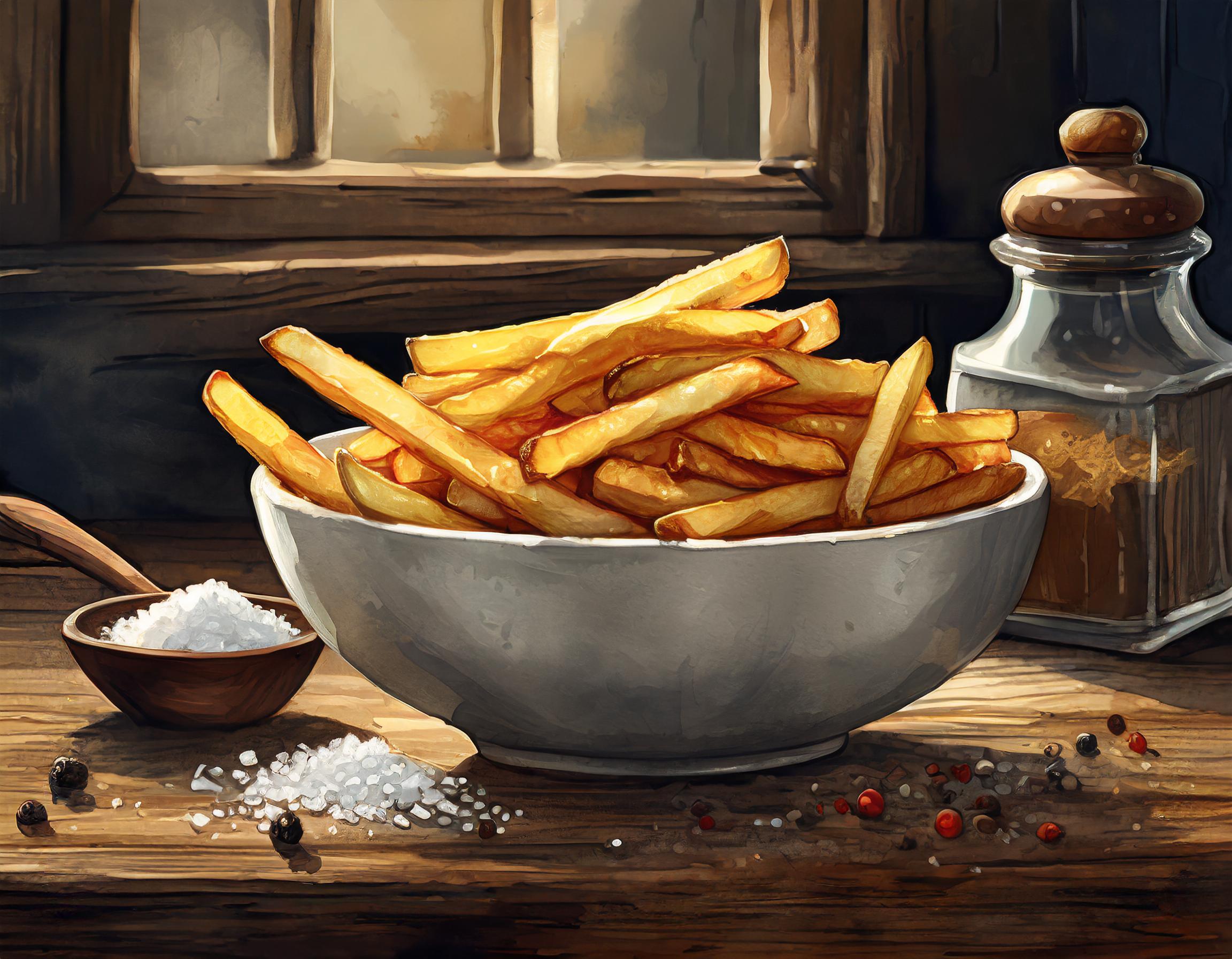 A close-up view showcases an old wooden table with a white bowl filled with fries, carefully placed to not overflow. The only other items visible on the table are grains of coarse salt and a pepper shaker, emphasizing a minimalist setting. There is nothing else on the table, focusing all attention on the bowl of fries, the salt, and the pepper. This composition highlights the simplicity and rustic elegance of the scene, with the wooden table's texture adding depth and character.