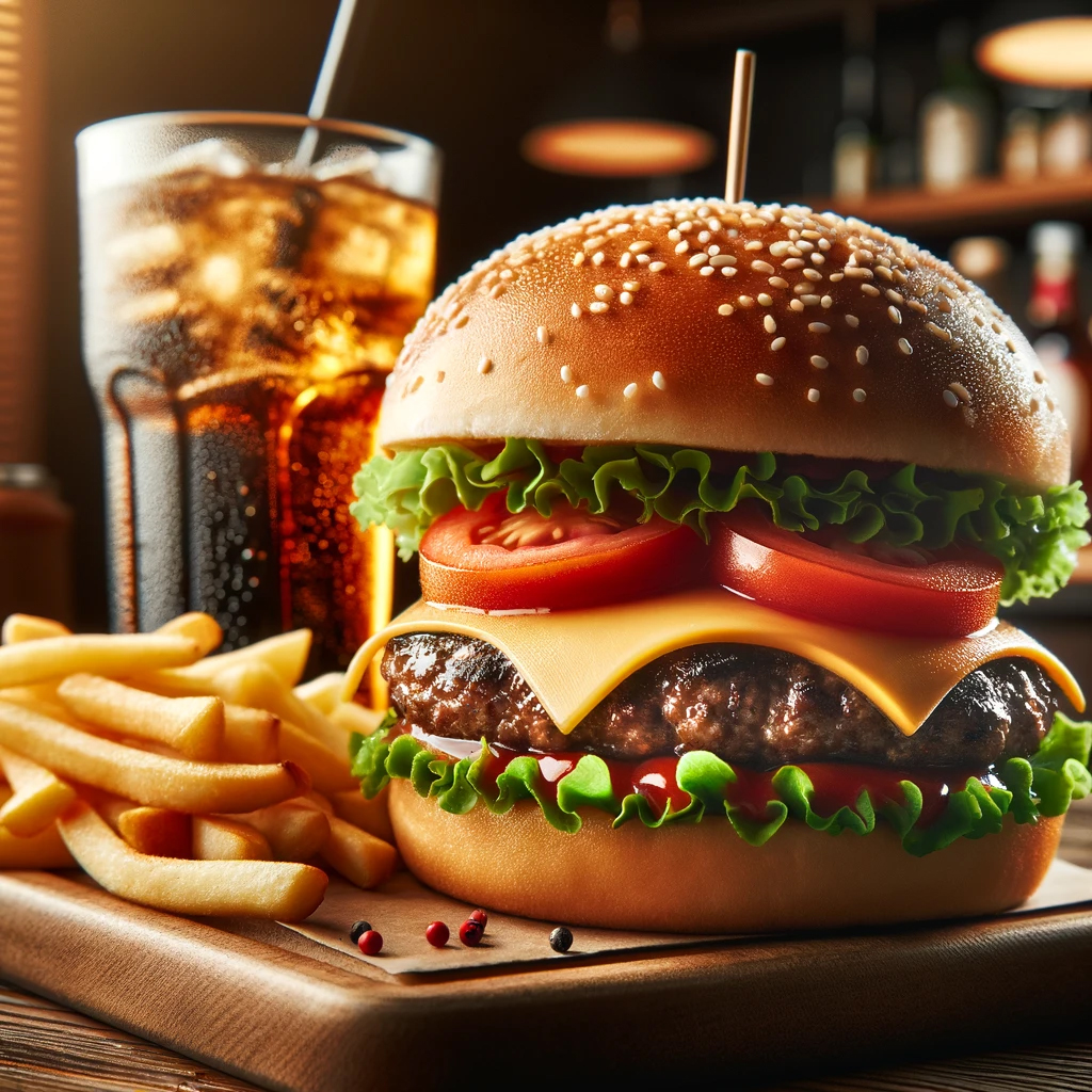 Sur une table de restaurant en gros plan, un grand hamburger avec des frites et une boisson est servi au premier plan, avec une vue de face.