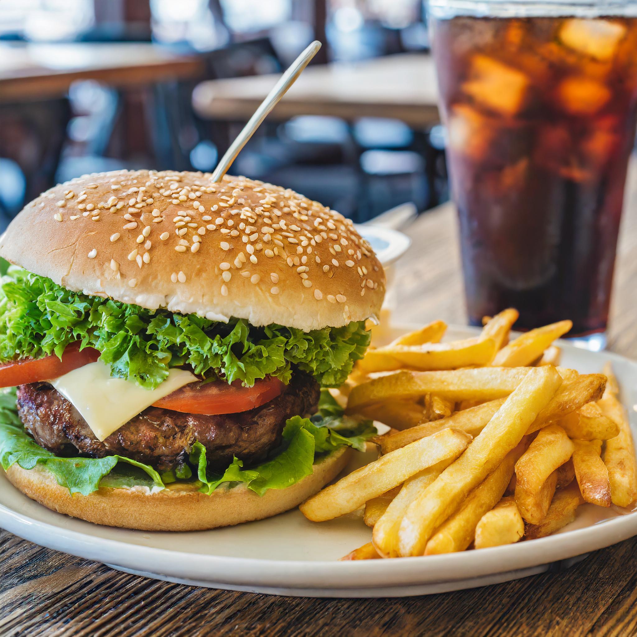 Sur une table de restaurant en gros plan, un grand hamburger avec des frites et une boisson est servi au premier plan, avec une vue de face.
