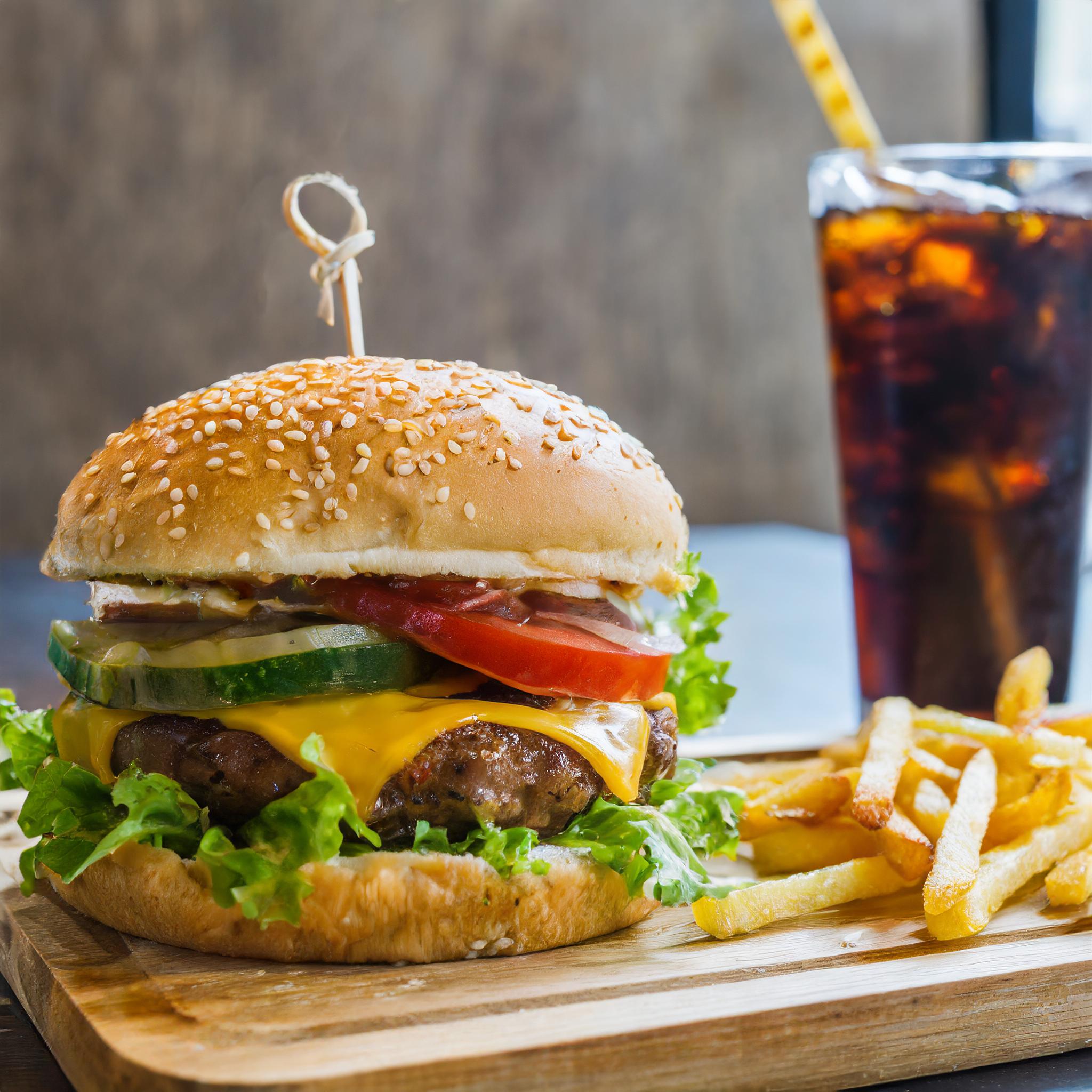 On a restaurant table in close-up, a large hamburger with fries and a drink is served in the foreground, with a front view.