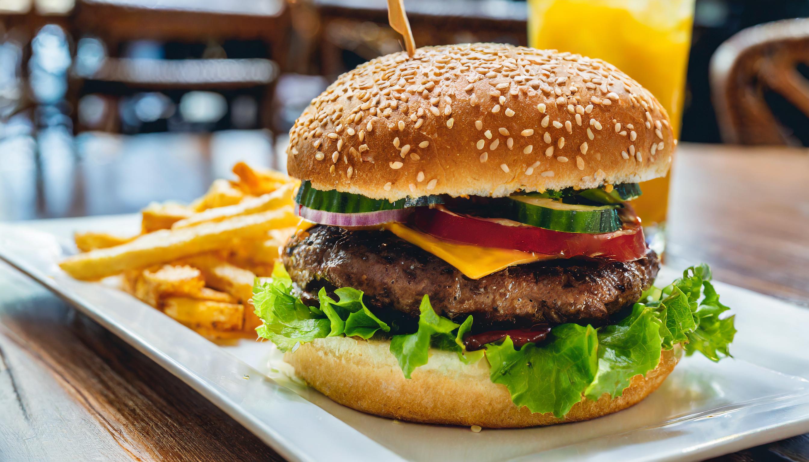On a restaurant table in close-up, a large hamburger with fries and a drink is served in the foreground, with a front view.