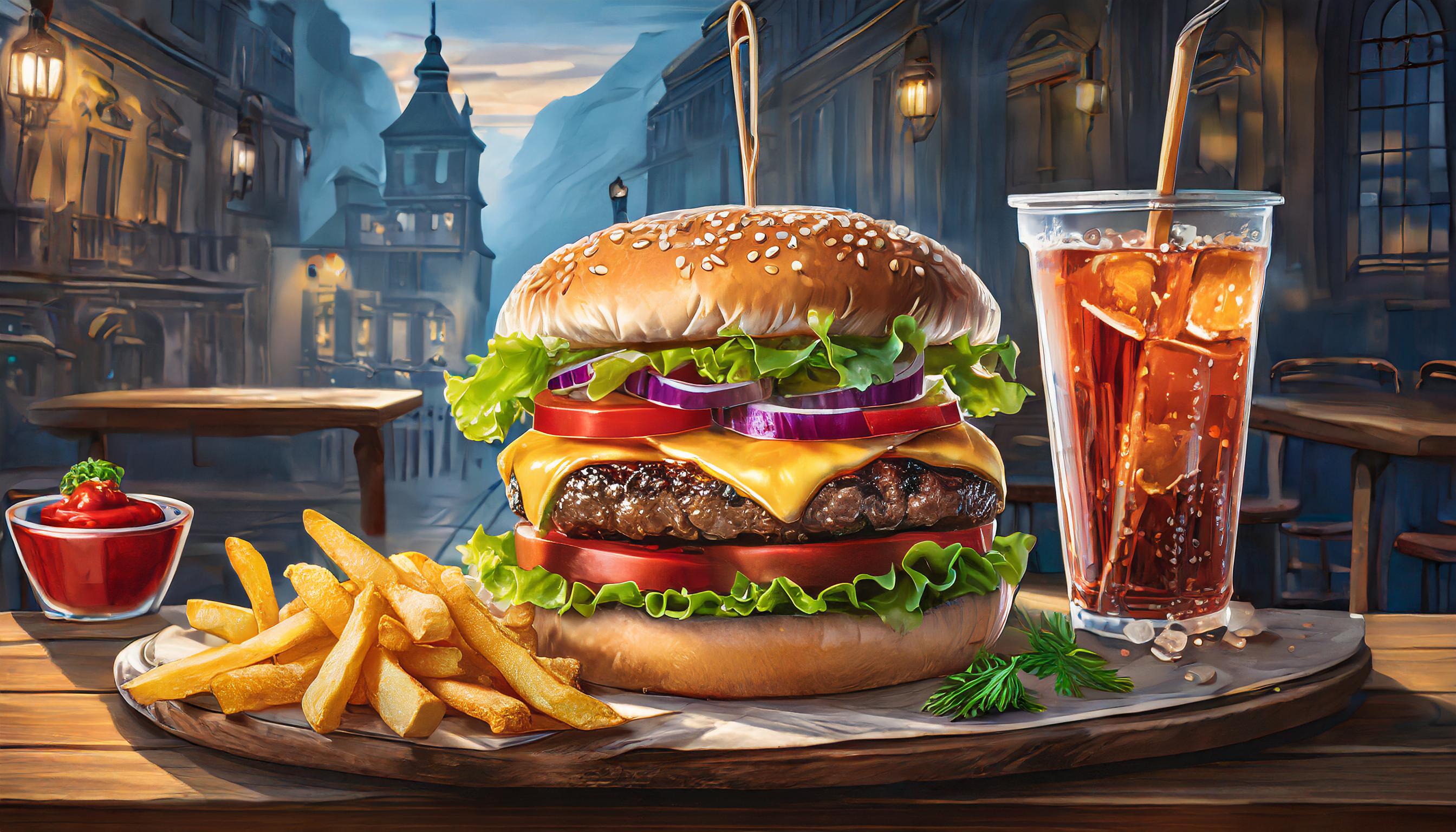 Sur une table de restaurant en gros plan, un grand hamburger avec des frites et une boisson est servi au premier plan, avec une vue de face.