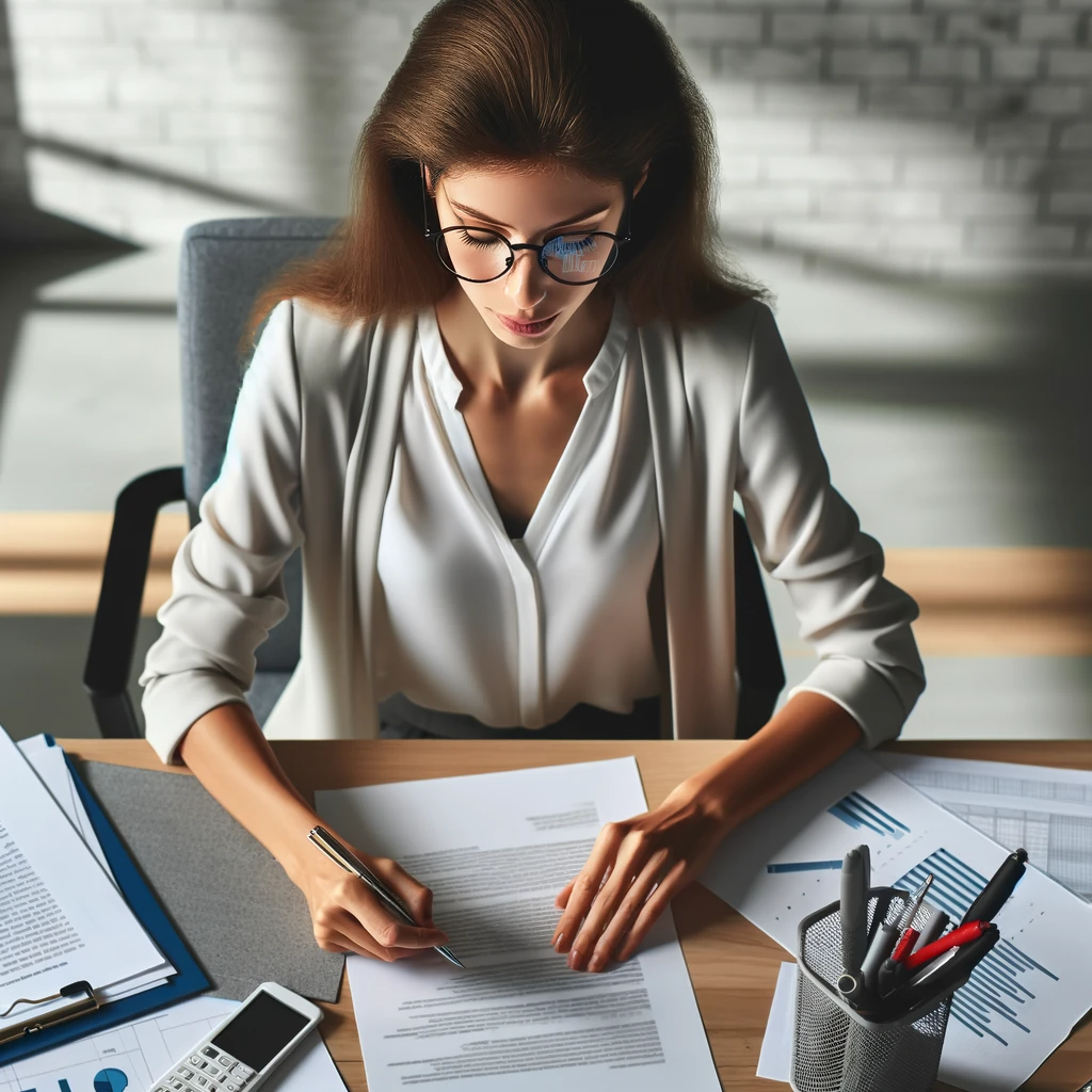 A modern office setting with a woman wearing glasses working at a desk. The desk is cluttered with various documents. She is actively writing something. The viewpoint is a 3/4 overhead angle, showcasing the working environment and the woman's focused demeanor.