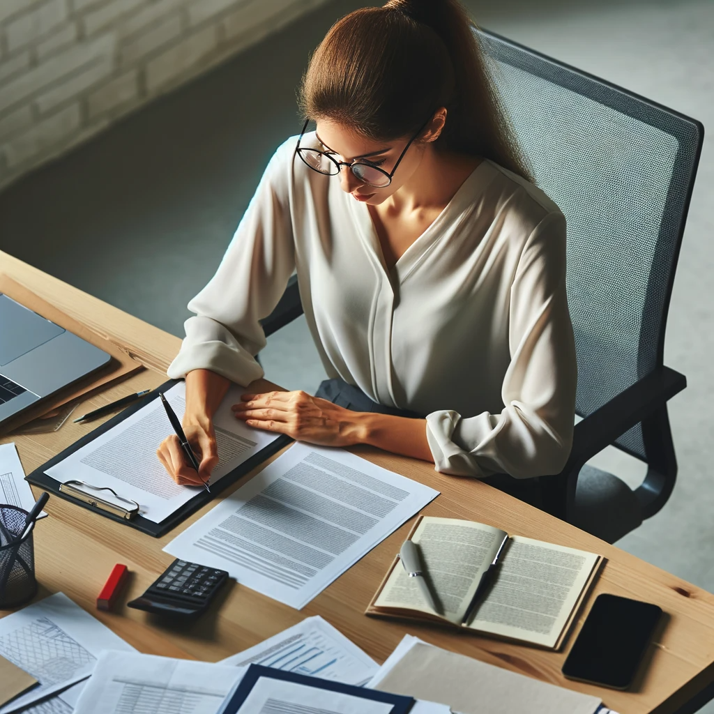 A modern office setting with a woman wearing glasses working at a desk. The desk is cluttered with various documents. She is actively writing something. The viewpoint is a 3/4 overhead angle, showcasing the working environment and the woman's focused demeanor.