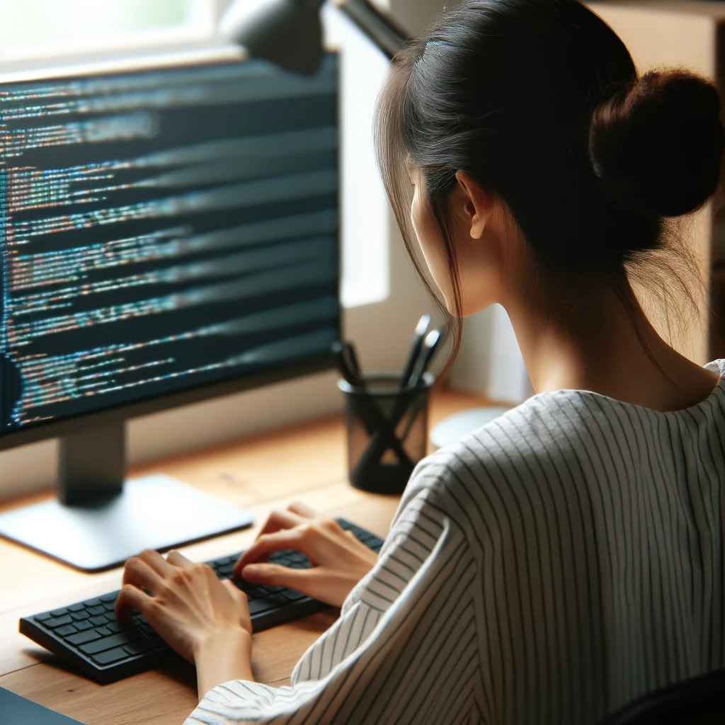 A woman seen from a 3/4 angle from behind, sitting at a desk and typing on a keyboard. On her desk is a screen displaying lines of code. The focus is on her typing and the screen with the code, capturing the essence of a work environment in the tech industry.