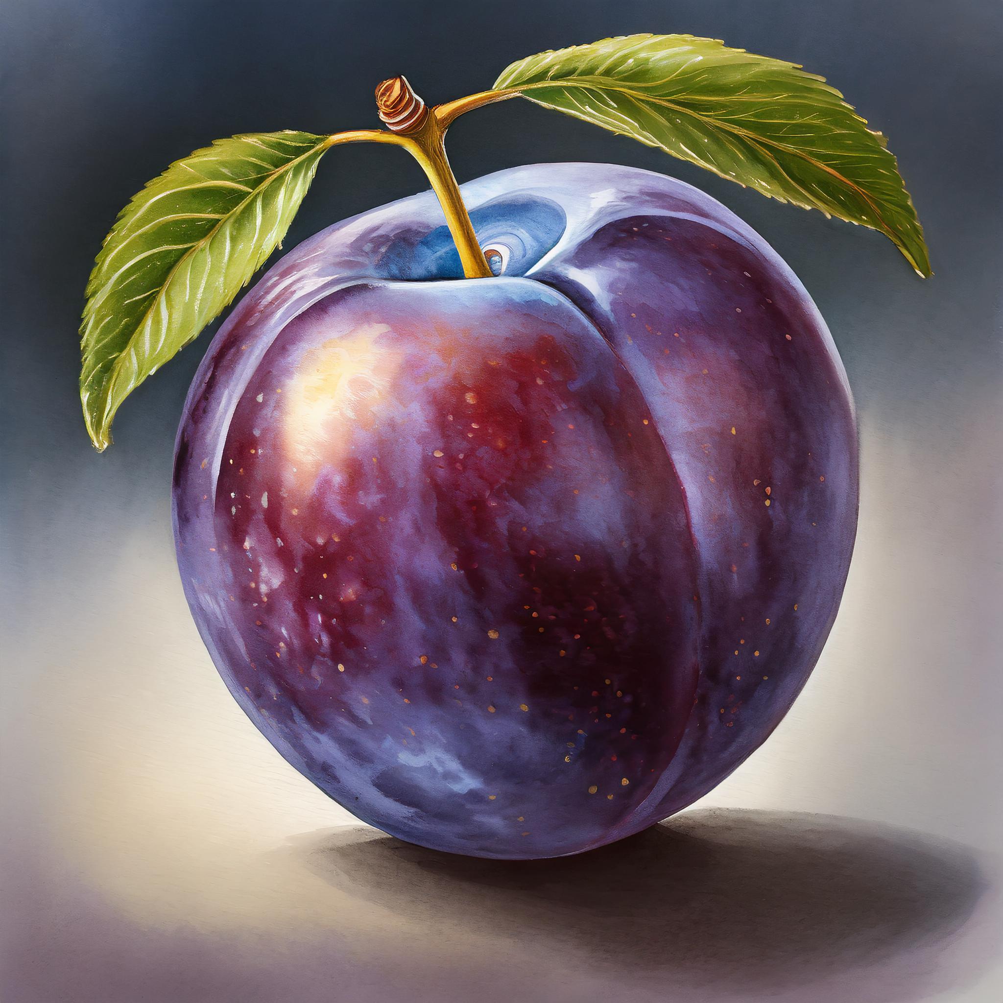 A highly detailed and realistic image of a single, whole plum isolated on a plain white background. The fruit occupies the entire frame without exceeding the boundaries. It is not cut in half, and there is only one plum. The image is very precise, highlighting the texture of the plum's skin. The plum is illuminated by soft light, enhancing its shape while maintaining the focus on its texture. The plum is without any leaves.
