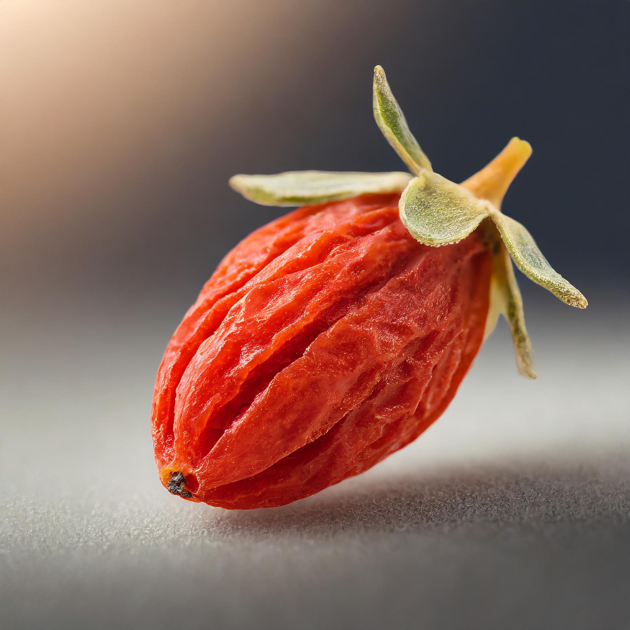 Une image hautement détaillée et réaliste d'une unique baie de Goji entière isolée sur un fond blanc uni. La baie remplit le cadre sans déborder, mettant en avant sa texture en détail complet. Il n'y a pas de feuilles attachées à la baie de Goji, et elle est illuminée par une lumière douce qui met en valeur sa forme et sa texture.