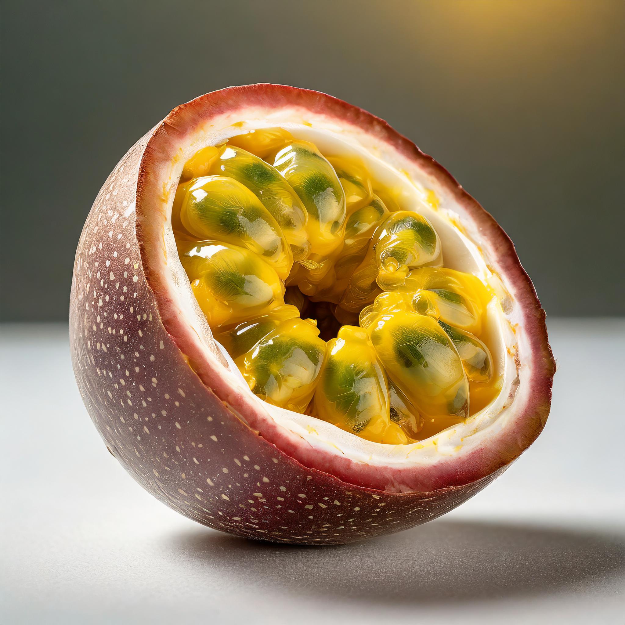 A highly detailed and realistic image of a single passion fruit isolated on a plain white background. The fruit occupies the entire frame without overflowing. The passion fruit is whole, not cut in half, and there's only one passion fruit. The image is very precise, showcasing the texture of the skin. The passion fruit is illuminated by soft light, highlighting its shape without the presence of leaves. The overall composition emphasizes the intricate details of the fruit's surface.
