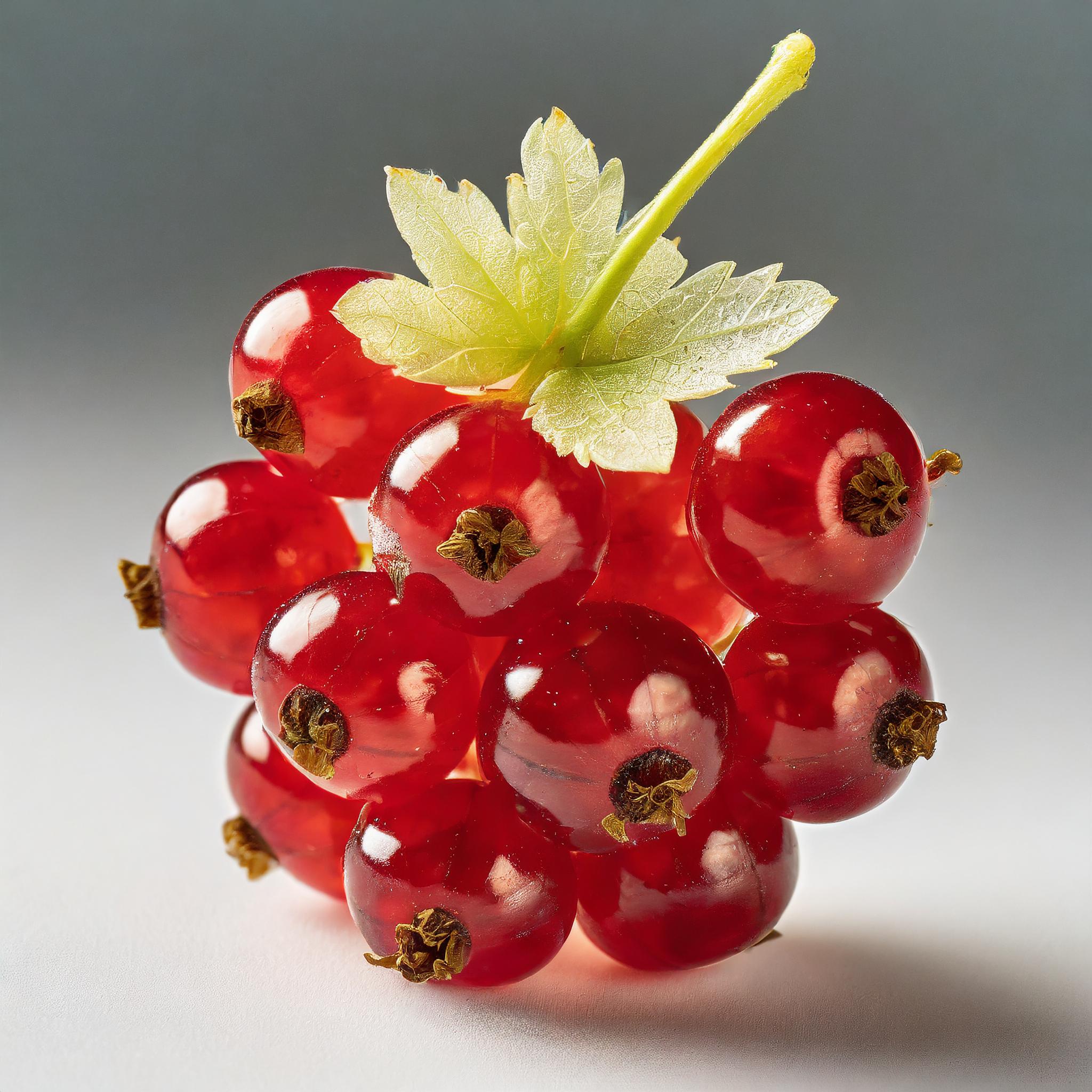 A highly detailed and realistic image of a single red currant isolated on a plain white background. The fruit occupies the entire frame without exceeding it. The red currant is whole, not cut in half, and there's only one red currant. The image is very precise, allowing one to appreciate the texture of the skin. The red currant is illuminated by soft light, yet it still highlights its shape. The red currant is without any leaves.